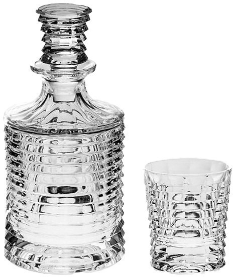 Кожен елемент виготовлено з міцного кришталю з виразною геометричною текстурою. Така структура не лише приваблює, а й робить користування максимально зручним — склянки комфортно лежать у руці, а графін наливає напій акуратно, без крапель.
