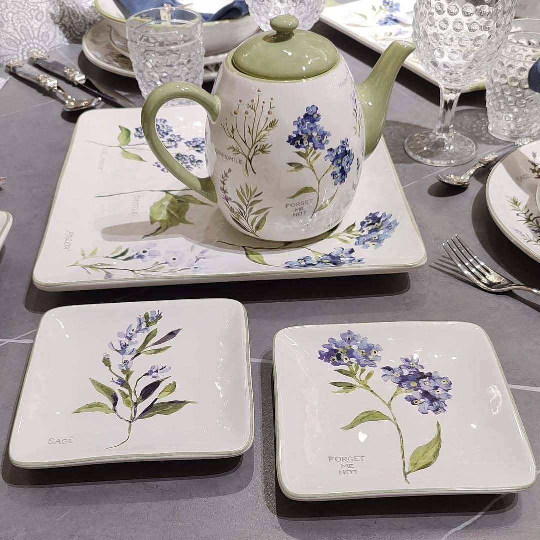 Набір квадратних тарілок для закусок «Ароматні Трави» від Certified International — це гармонія природи та мистецтва в кожній деталі. На білосніжній кераміці зображені витончені гілочки лаванди, розмарину та незабудок — символи затишку й свіжості. Комплект із 4 тарілок розміром 15×15 см ідеально підходить для канапе, десертів або сирної подачі. Високоякісна кераміка стійка до нагрівання й легко миється в посудомийній машині. Такий набір стане вишуканим акцентом вашої сервіровки та чудовим подарунком для поціновувачів природного стилю. Створіть атмосферу спокою й тепла за столом із колекцією «Ароматні Трави».