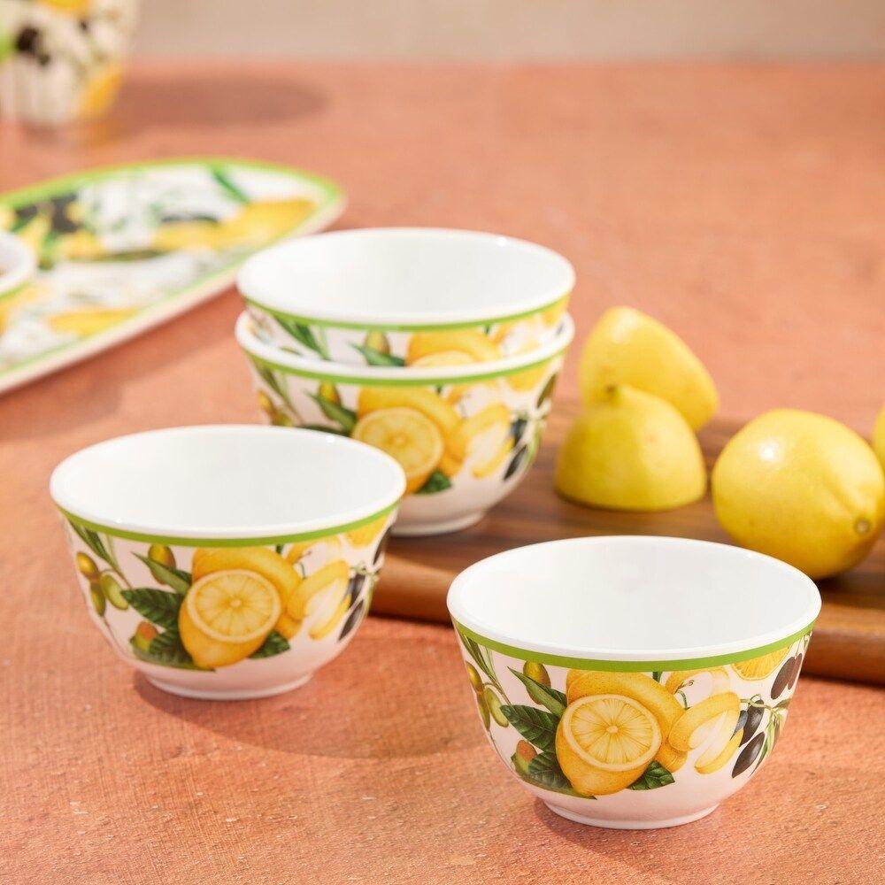 Набір меламінових піал «Лимони та оливки» Certified International — це яскраве доповнення до сервірування в стилі сонячного Середземномор’я. Соковиті лимони та зелені гілки створюють настрій літнього сніданку навіть у звичайний день. Діаметр 10 см ідеально підходить для горішків, соусів, ягід, морозива чи порційних салатів. Меламін легкий, міцний, не б’ється й легко миється, тому такі піали зручно брати на пікнік або використовувати вдома щодня. Вони не вбирають запахи й довго зберігають яскравість малюнка. Набір перетворює подачу навіть простих частувань на стильний та приємний елемент столу.