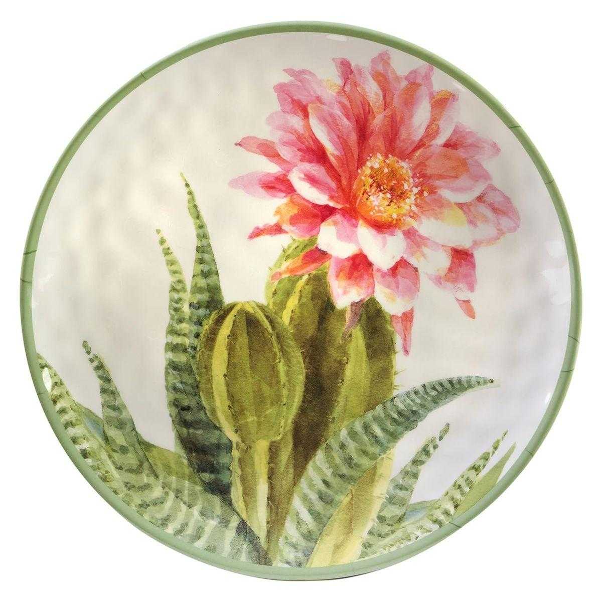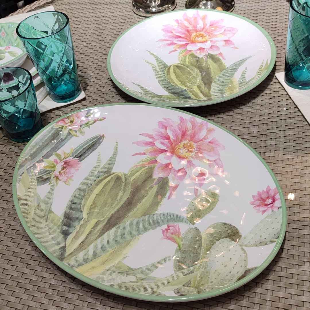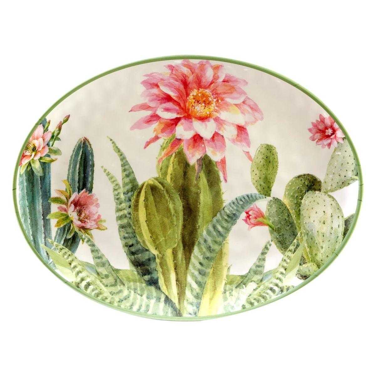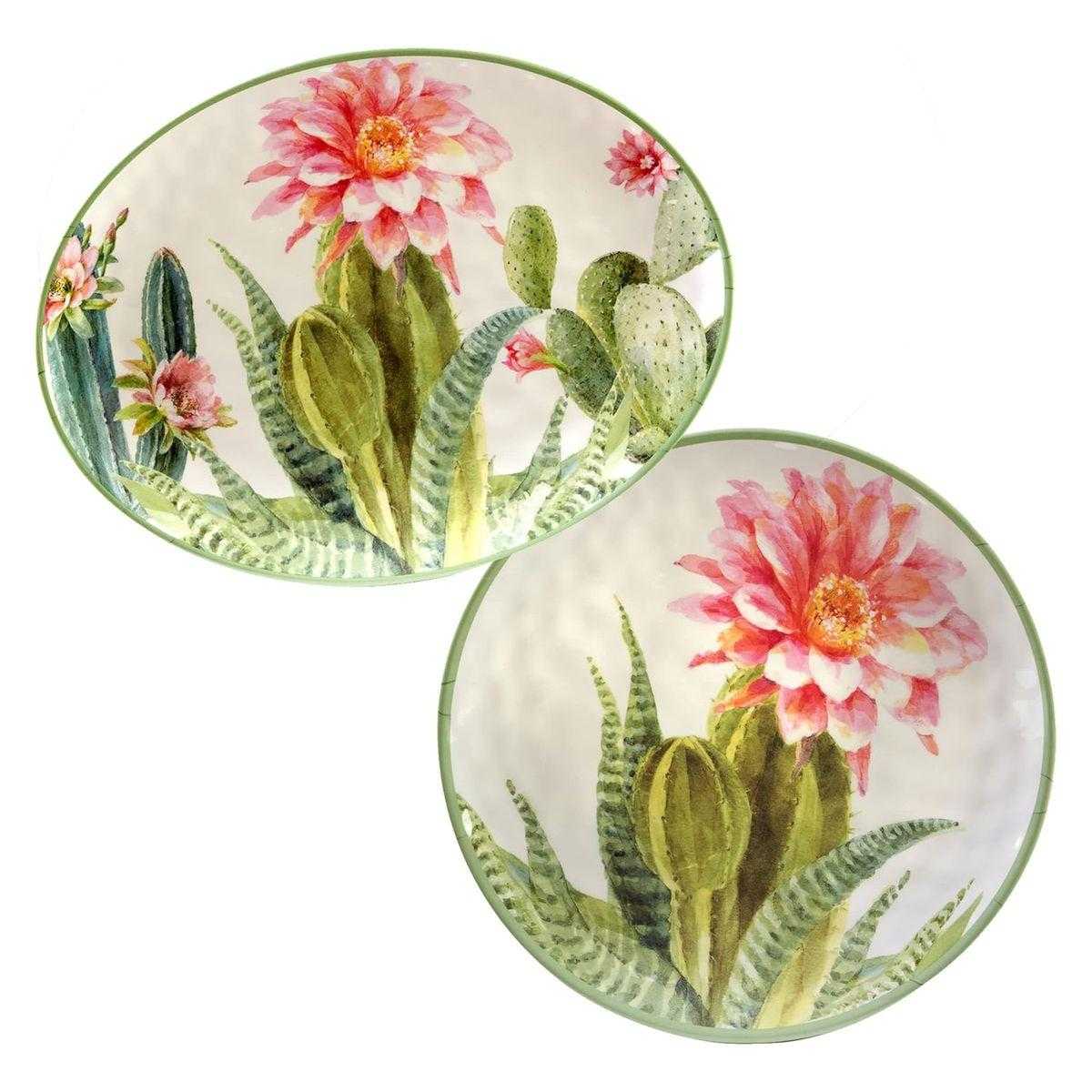 Набір меламінових блюд «Красуня Пустелі» включає овальне блюдо розміром 46×34 см та велике кругле блюдо діаметром 36 см. Міцний ударостійкий матеріал не містить бісфенолу й повністю безпечний для щоденного використання. Яскравий принт пустельних кактусів і квітів створений за оригінальними ескізами художниці Донни Ніл. Блюда підходять як для домашньої сервіровки, так і для подачі страв на відкритому повітрі. Їх можна мити в посудомийній машині за температури не вище +70°. Посуд виготовляється на заводах компанії Certified International у КНР.