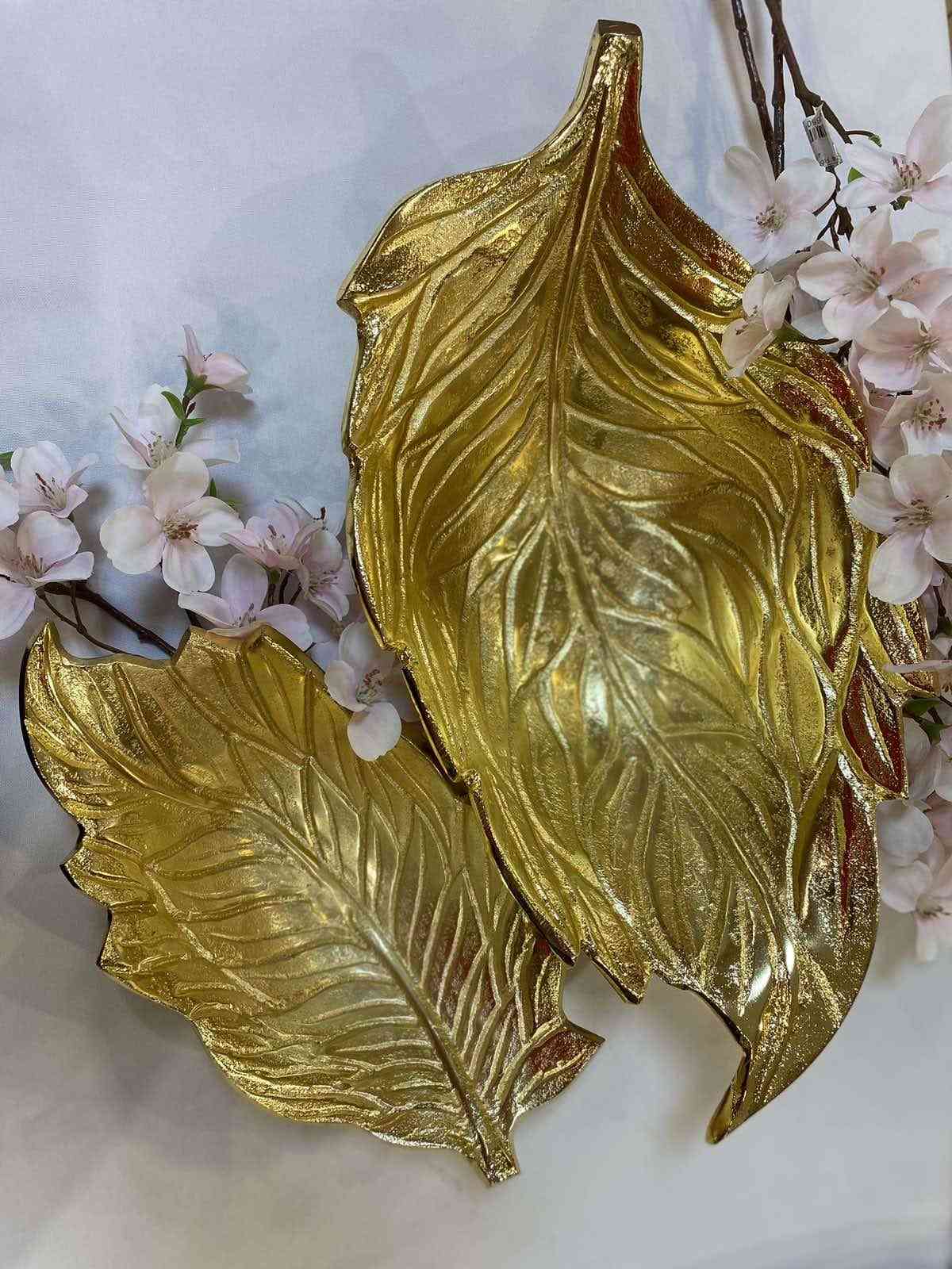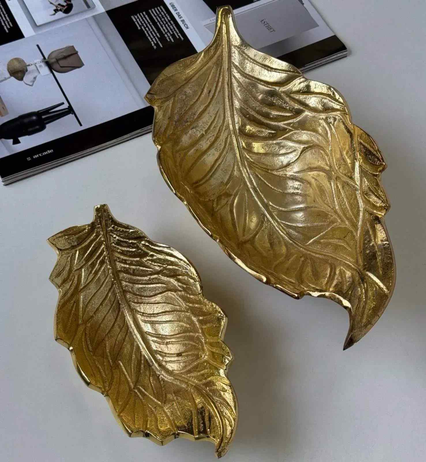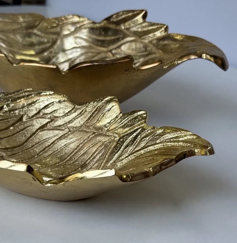 Цей набір із двох декоративних тарілок у формі листя — справжня знахідка для тих, хто цінує стильні деталі. Вироби виготовлені з металу та вкриті благородним золотистим шаром, що красиво відбиває світло та підкреслює рельєф. Кожна лінія, кожен вигин — точно опрацьовані, що додає естетичної глибини.