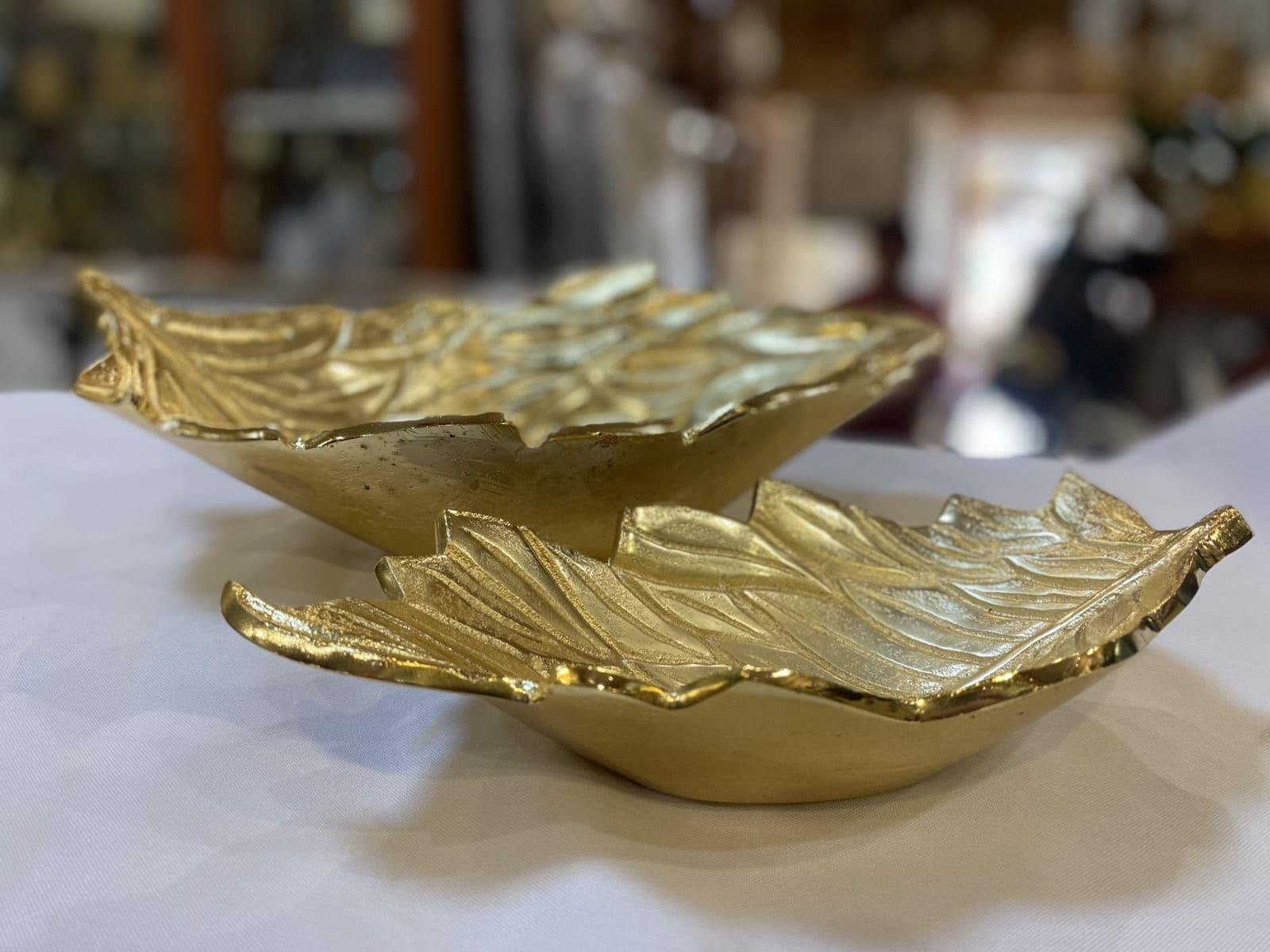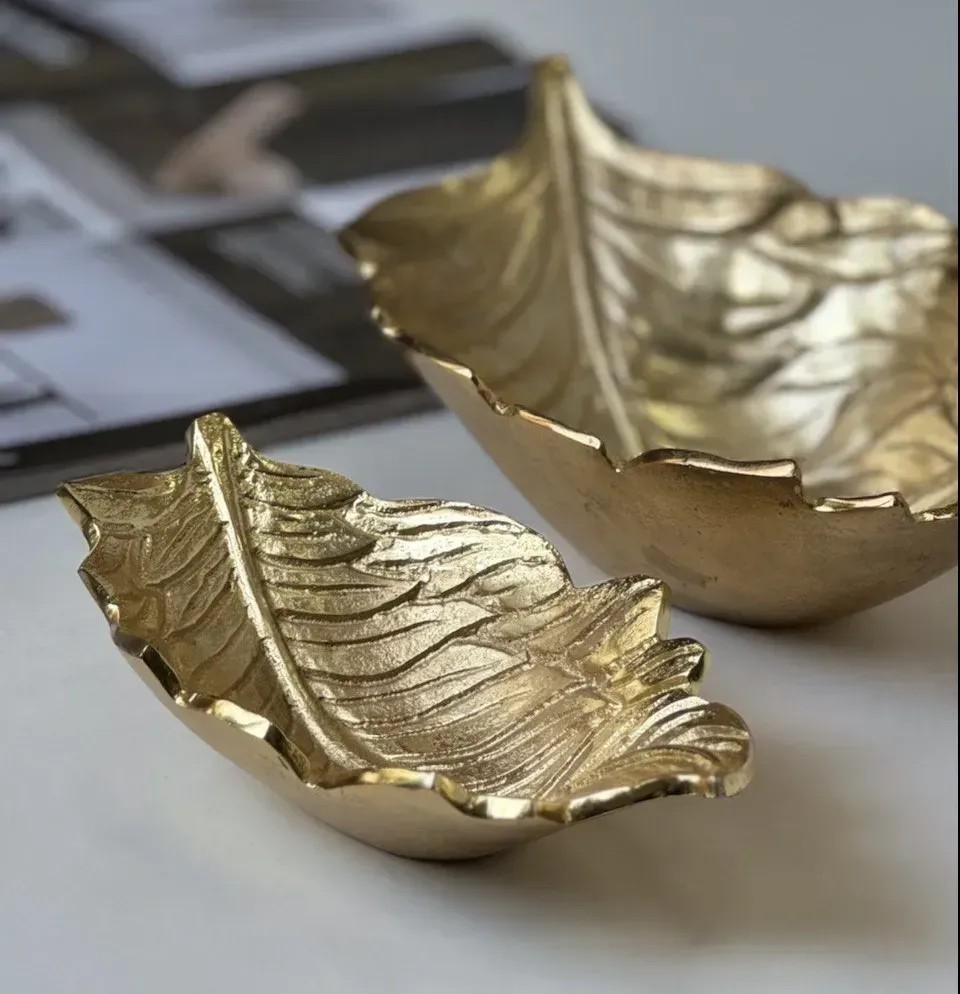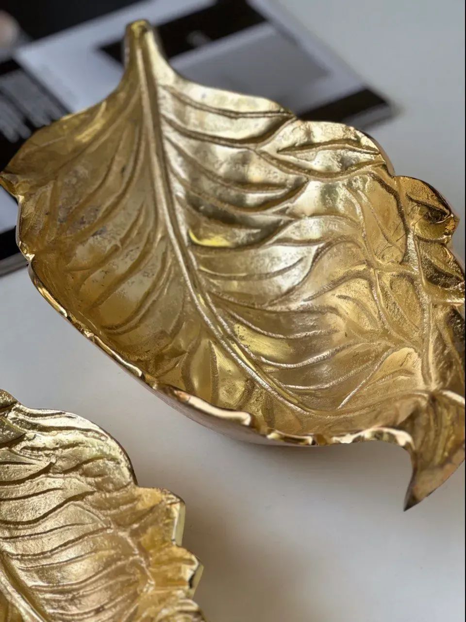 Цей набір із двох декоративних тарілок у формі листя — справжня знахідка для тих, хто цінує стильні деталі. Вироби виготовлені з металу та вкриті благородним золотистим шаром, що красиво відбиває світло та підкреслює рельєф. Кожна лінія, кожен вигин — точно опрацьовані, що додає естетичної глибини.