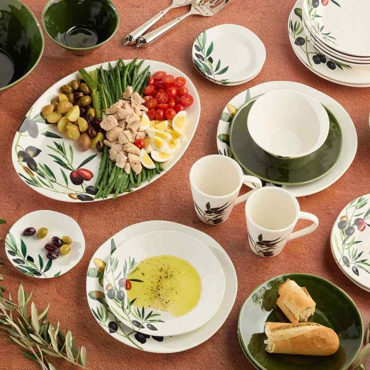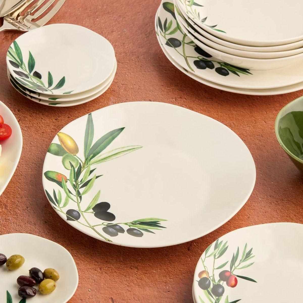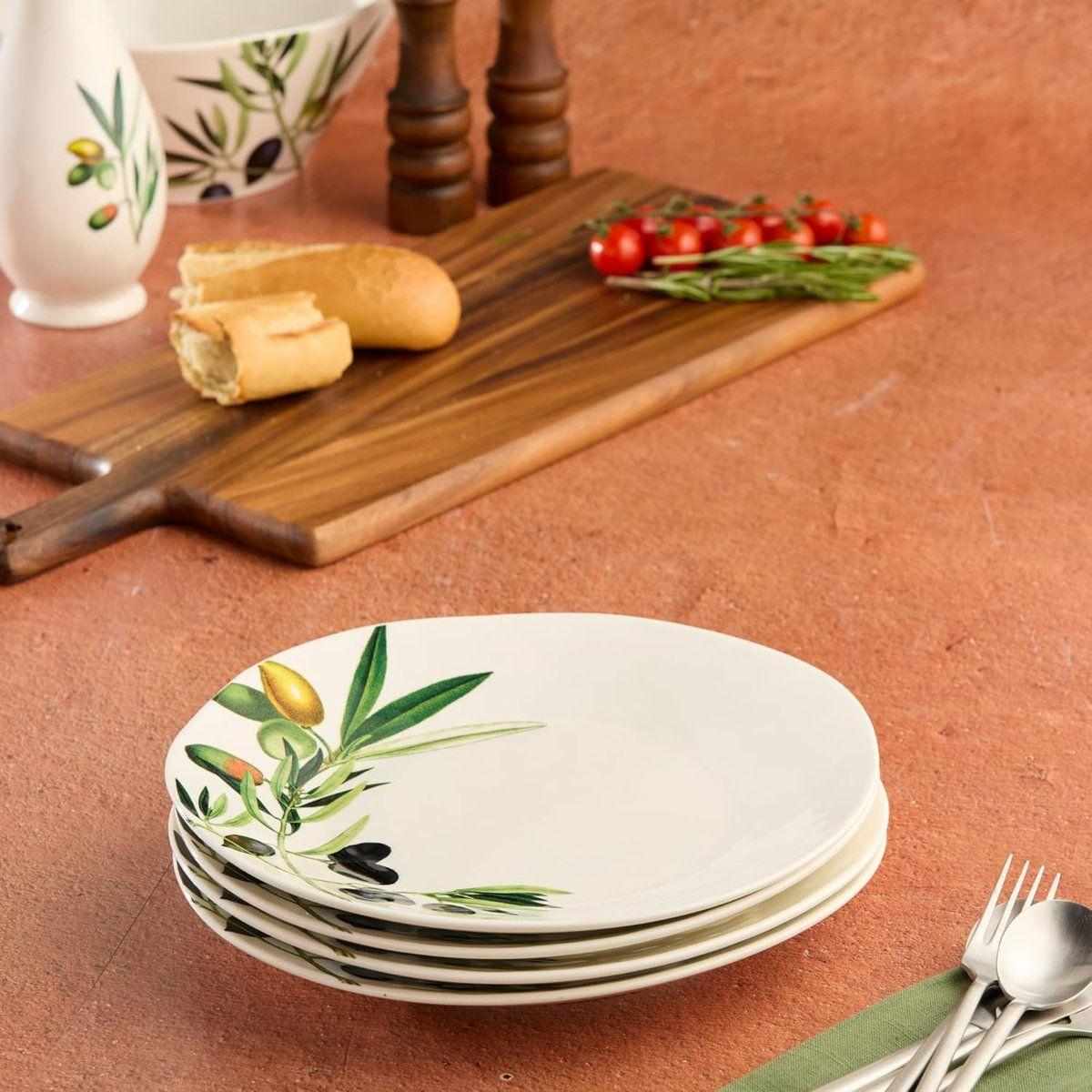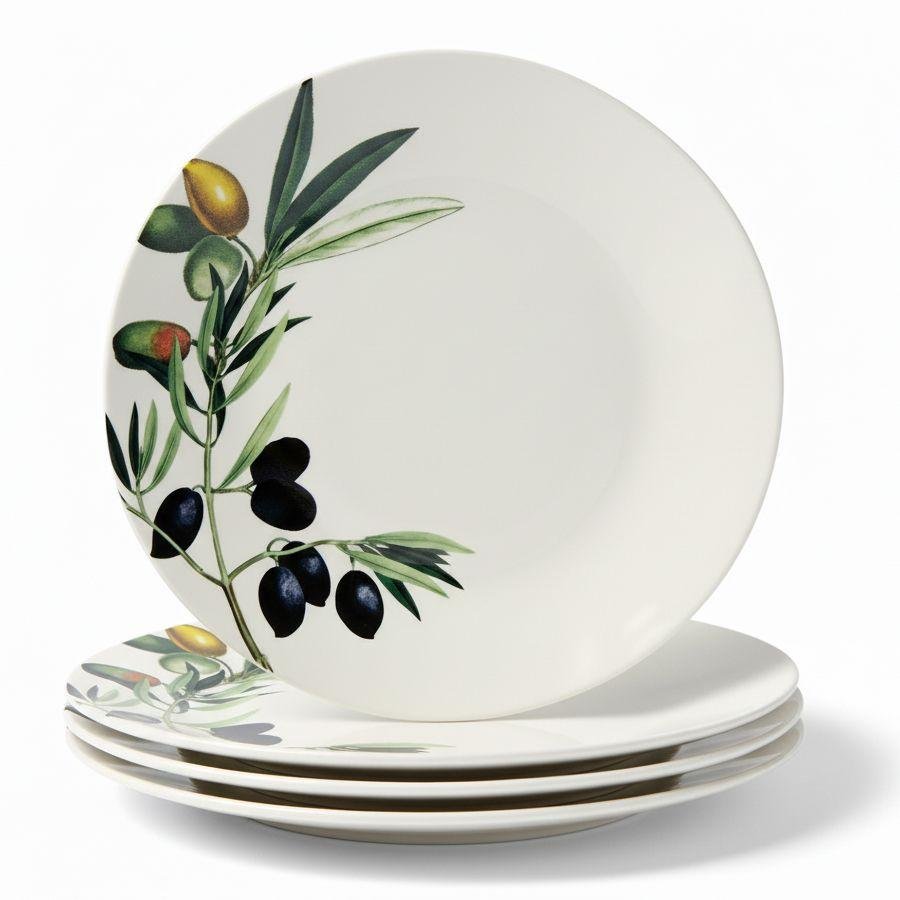 Цей вишуканий набір обідніх тарілок з ніжним оливковим візерунком створює атмосферу середземноморського тепла на будь-якому столі та підкреслює смак поданих страв. Кожна тарілка виглядає як маленький витвір мистецтва, наповнюючи сервірування свіжістю та природною гармонією. Ніжна кераміка приємно лежить у руці й робить щоденні прийоми їжі візуально яскравішими та затишнішими. Посуд можна мити в посудомийній машині та використовувати в мікрохвильовій печі для розігріву. Не рекомендується використовувати засоби для чищення з абразивними частинками. Такий набір — це стильний вибір для тих, хто хоче додати дому більше краси та подарувати собі задоволення від кожної сервіровки.