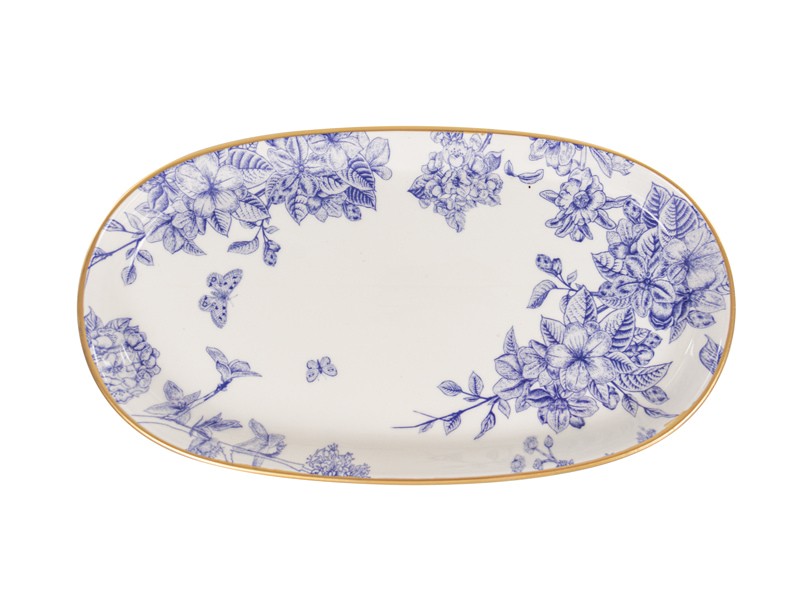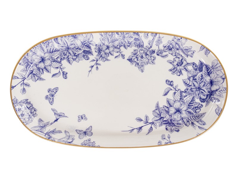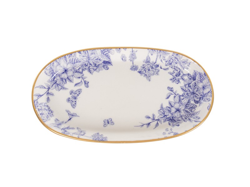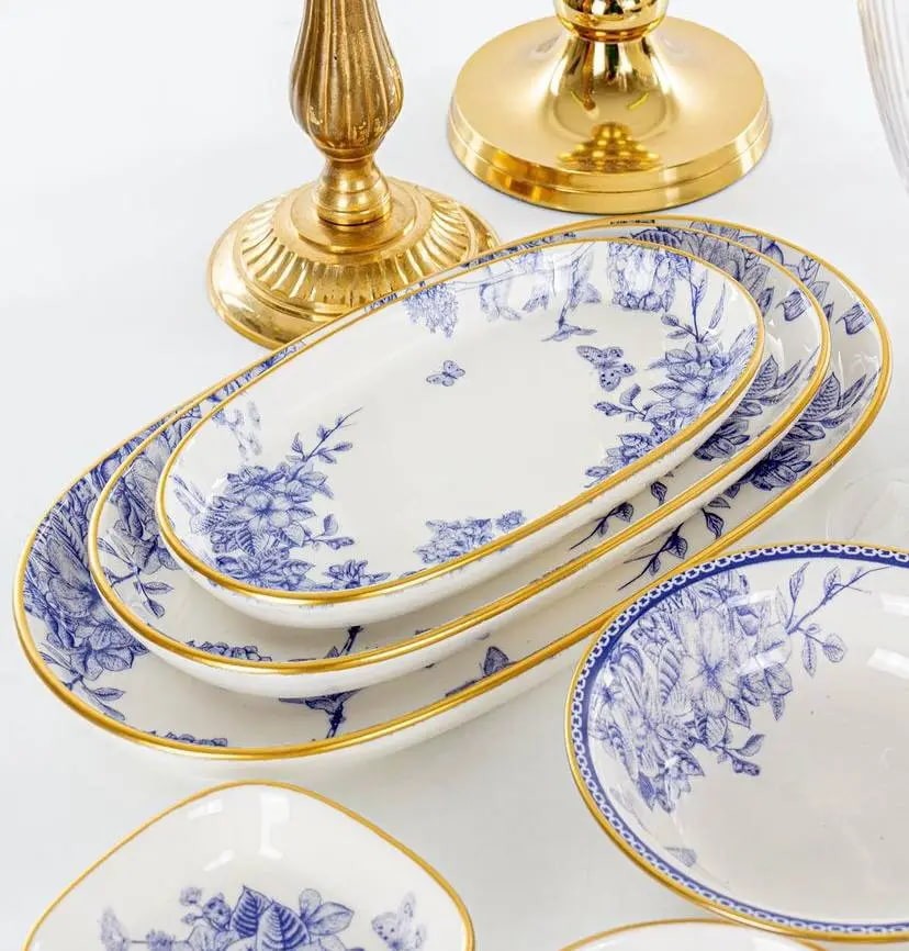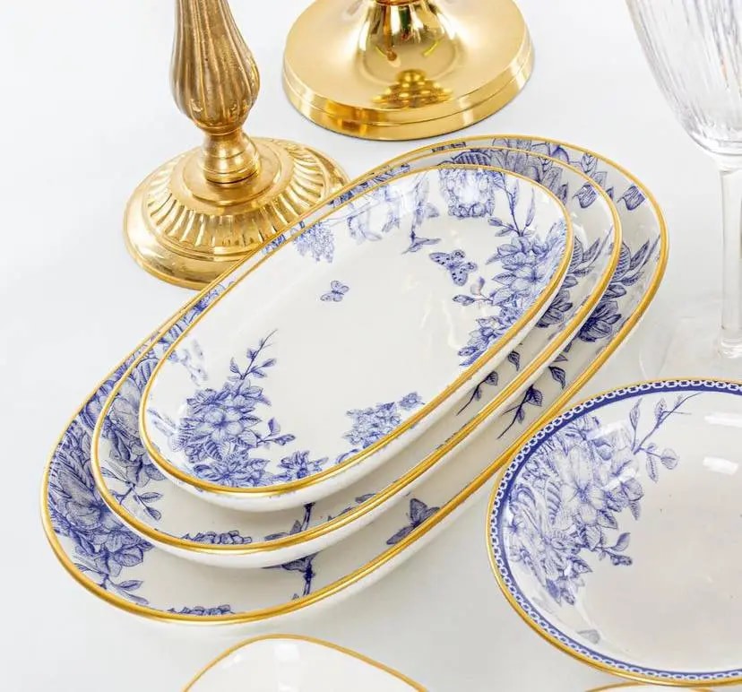 Набір з трьох вишуканих блюд Butterfly поєднує елегантний дизайн і практичність, перетворюючи кожну трапезу на справжню естетичну насолоду. Білосніжна кераміка оздоблена витонченим синім візерунком із метеликами та квітами — він виглядає вишукано й шляхетно, наче зі старовинного європейського сервізу. Тонка золота окантовка додає виробам святкового вигляду та робить їх справжньою прикрасою святкового столу.
