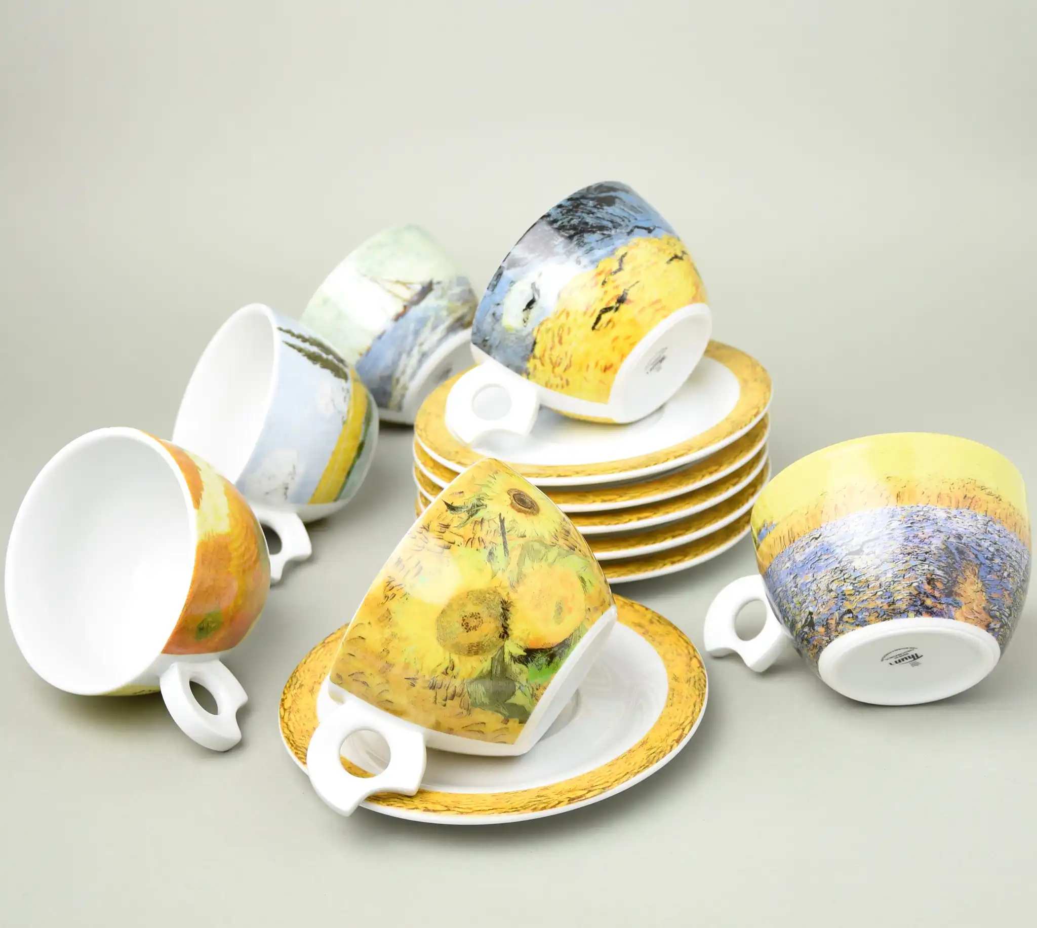 Відкрийте для себе справжню естетику у кожній деталі з фарфоровими чашками Dova, натхненними картинами Вінсента ван Гога. Це більше, ніж чашки — це мініатюрні полотна, що дарують натхнення і наповнюють кожну кавову паузу особливим змістом. Насичені кольори, відомі сюжети і золота облямівка — справжнє задоволення для очей і душі.