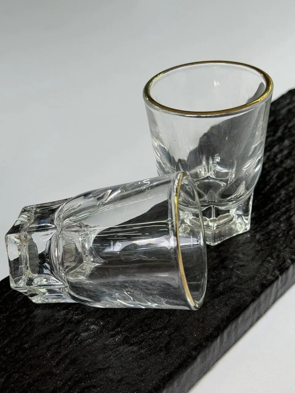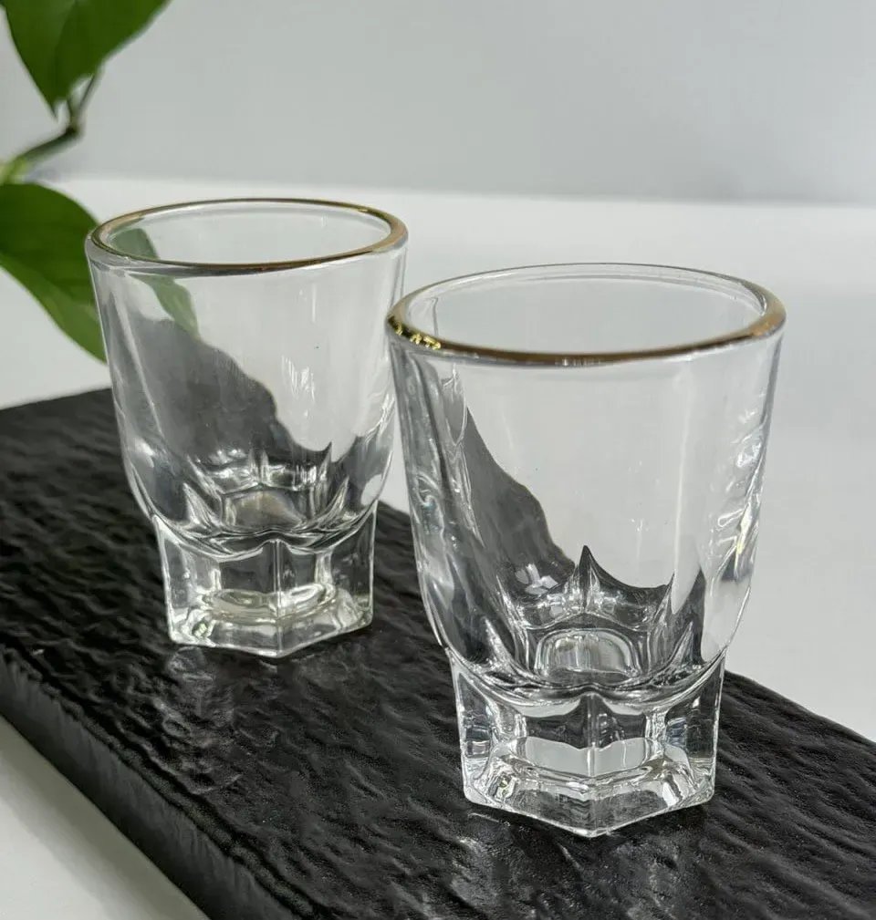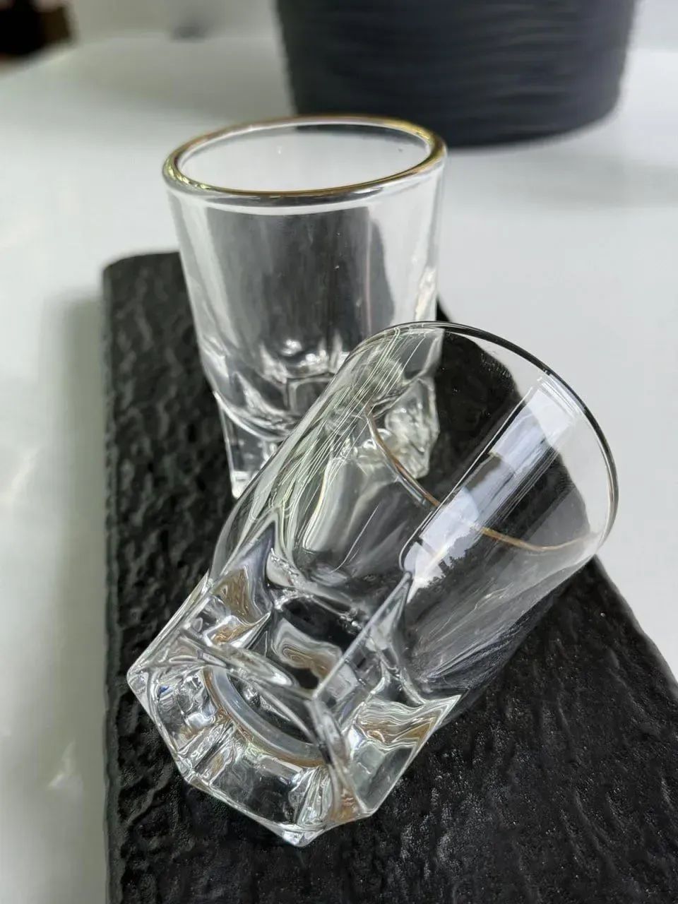 Ці скляні чарки об'ємом 70 мл поєднують лаконічний дизайн із тонкою золотою облямівкою, надаючи сервіровці особливого вигляду. Форма натхненна класикою: стійка основа й плавне звуження догори створюють зручну та естетичну подачу.