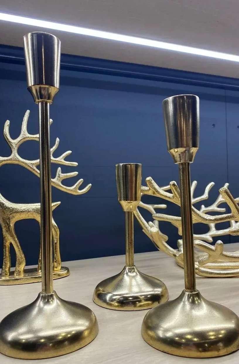 Цей набір з трьох металевих свічників — це не просто аксесуар для інтер’єру, а елемент, що одразу створює атмосферу затишку та стилю. Лаконічна форма, чисті лінії та благородний відтінок латуні роблять їх вдалим акцентом для будь-якої кімнати.