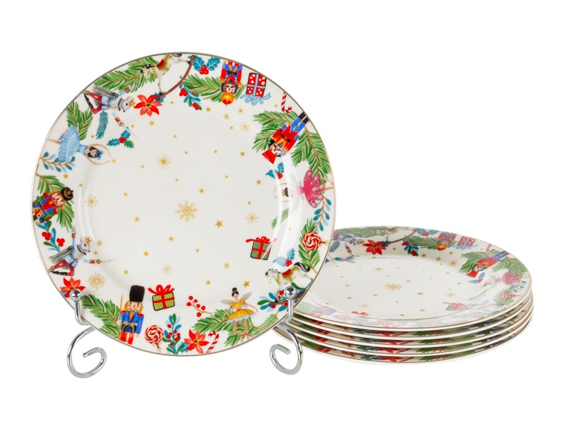 Набори тарілок White Christmas — це справжнє святкове полотно для вашого столу. Кожна тарілка прикрашена вишуканими новорічними мотивами: іграшковими солдатиками, балеринами, ялиновими гілками та яскравими подарунками, які перетворюють вашу сервіровку на сцену з улюбленої казки. Насичені кольори й тонкий фарфор роблять ці тарілки не просто посудом, а частиною декору, що створює атмосферу тепла та радості.