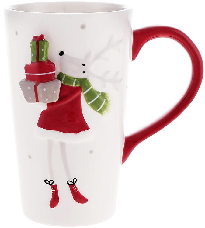 Набір високих новорічних кухлів білих Олені з подарунком 500 мл/ 4 шт