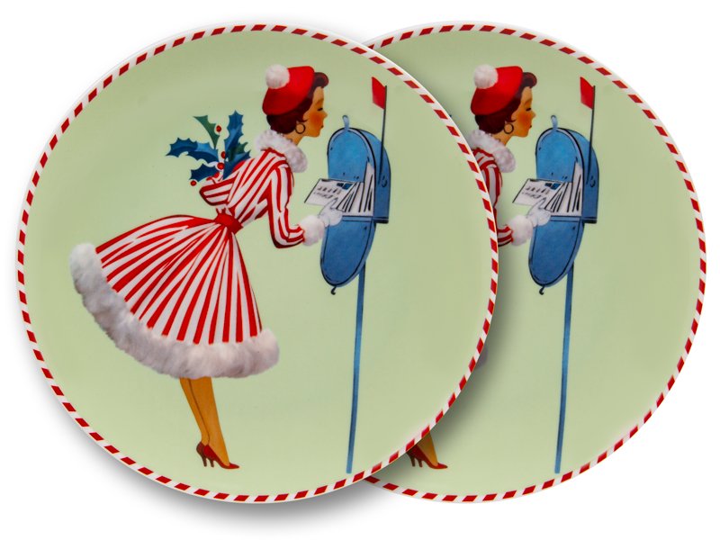 Набір із 2 порцелянових тарілок Miss Christmas 20,5 см — це яскраве втілення різдвяного настрою з ноткою ретро-шику. На ніжно-зеленому тлі зображена стильна дівчина у червоно-білому вбранні, що відправляє святкові листи. Малюнок нагадує атмосферу старовинних різдвяних листівок — теплих, щирих і сповнених очікуванням дива.