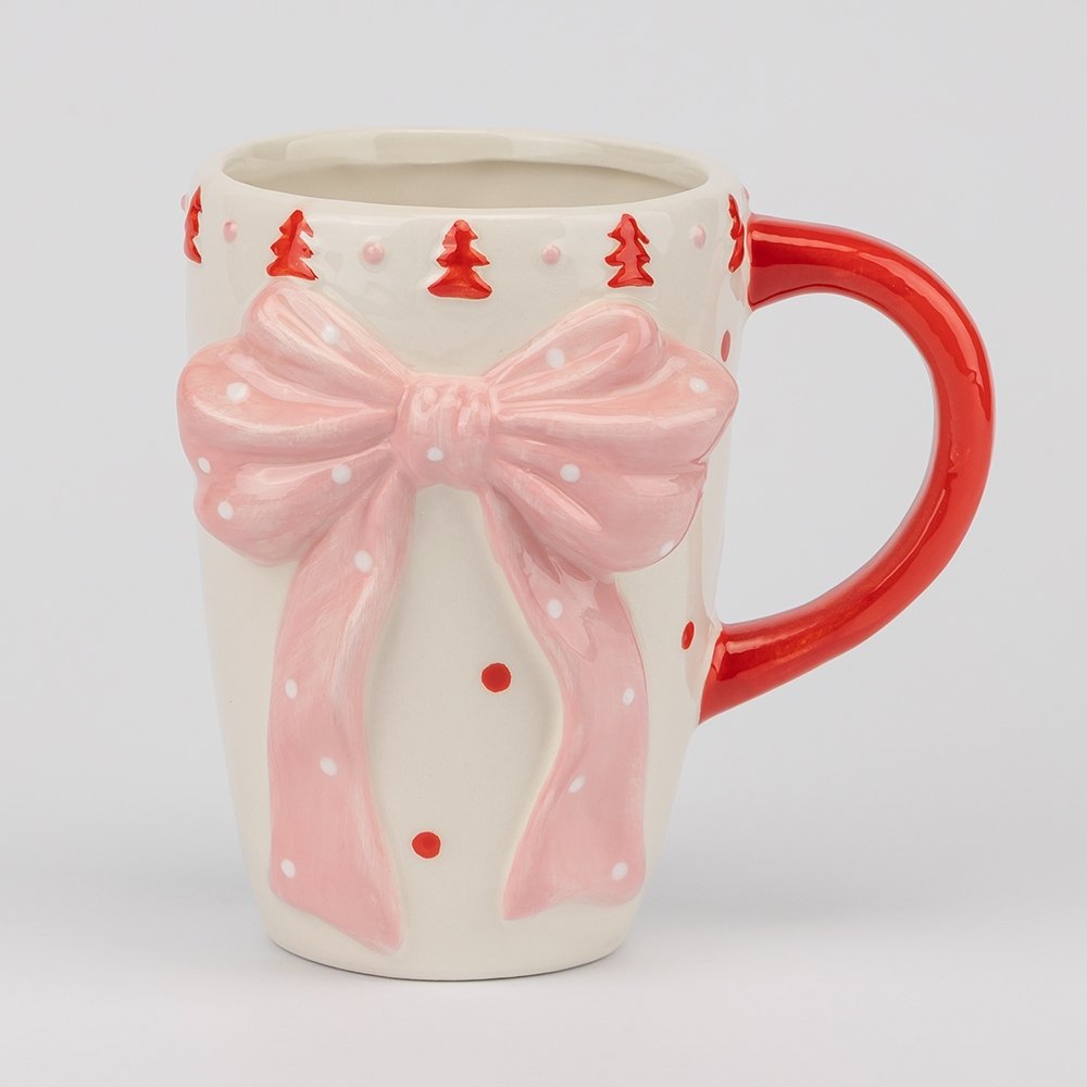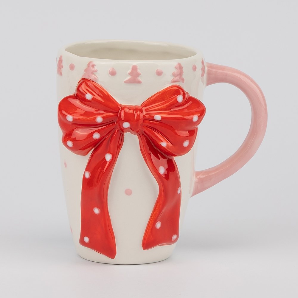 Дизайн натхненний святковою атмосферою: ніжно-рожева та насичено-червона кружки прикрашають ваш стіл, створюючи відчуття затишного зимового ранку. Об’ємні банти з акуратними горошками додають грайливості, а мініатюрні ялинки по верхньому краю створюють казковий акцент. Навіть порожня кружка виглядає як елемент декору — її приємно поставити на кухонну полицю або під ялинку.