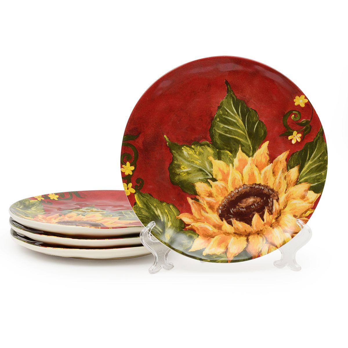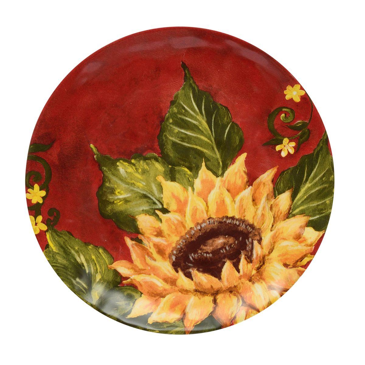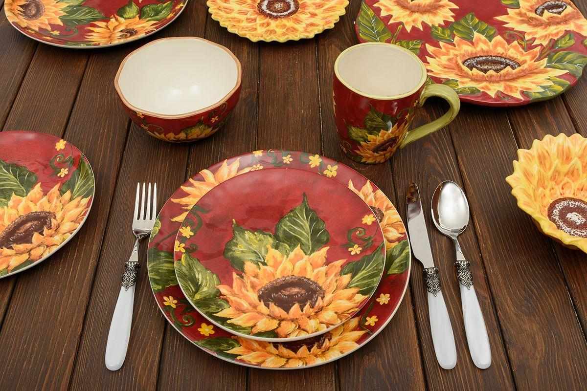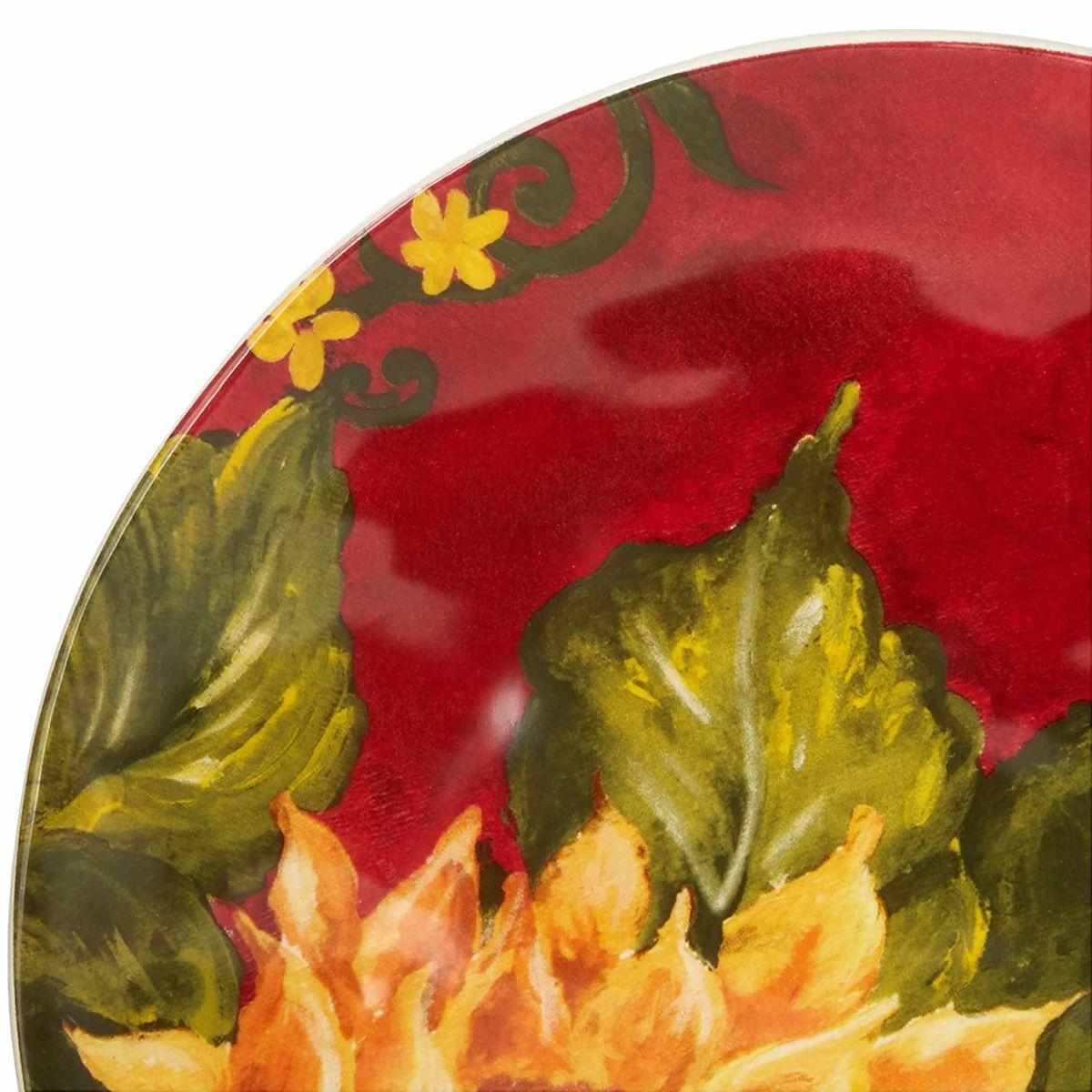 Оригінальний дизайн у вигляді соковитих жовтих соняшників на тлі яскраво-червоного західного неба, що прикрасив салатні тарілки, розроблений та втілений у життя студією художнього декору Tre Sorelle Studios. Принт зроблений у високій роздільній здатності, тому розглянути кожну деталь олійного живопису можна неозброєним оком.