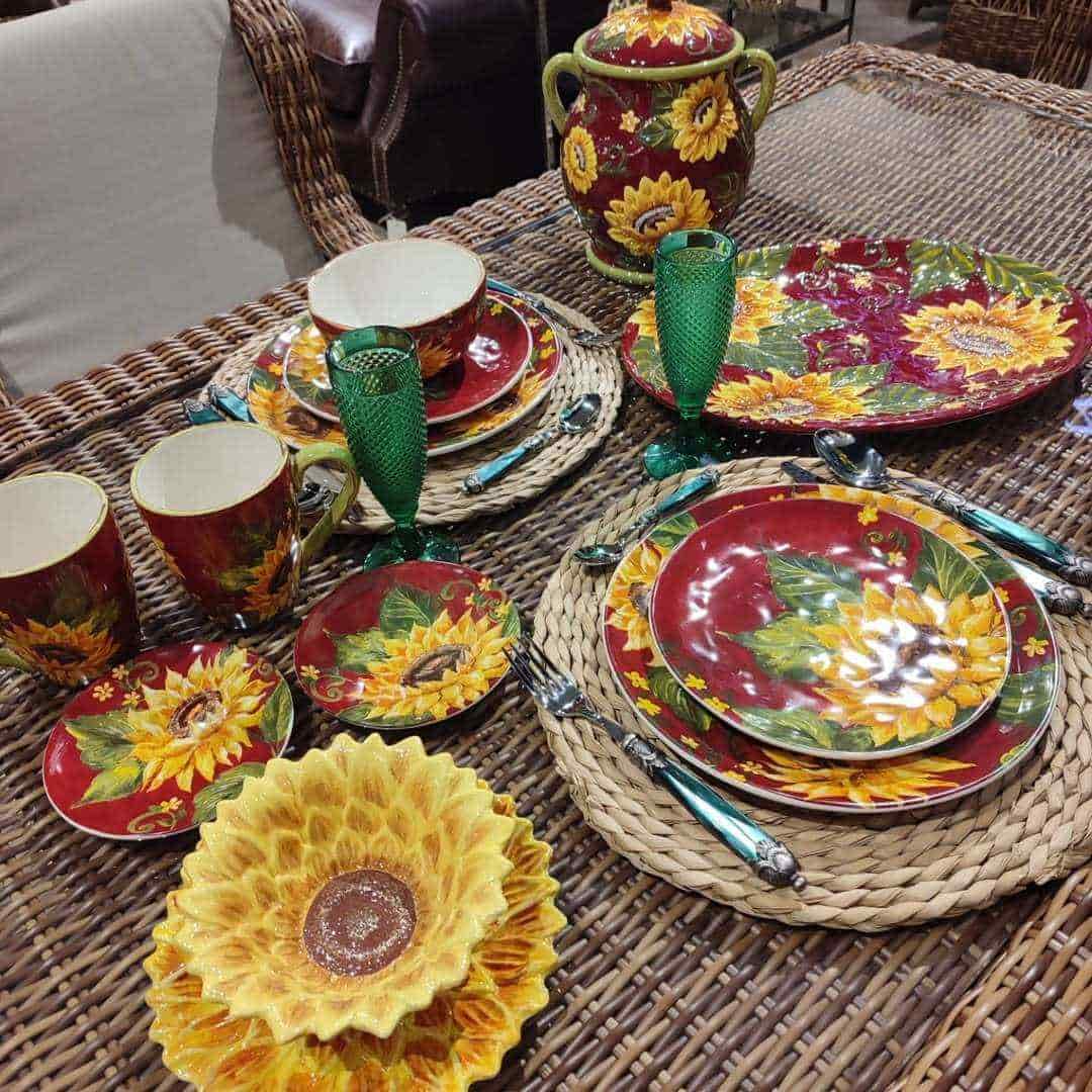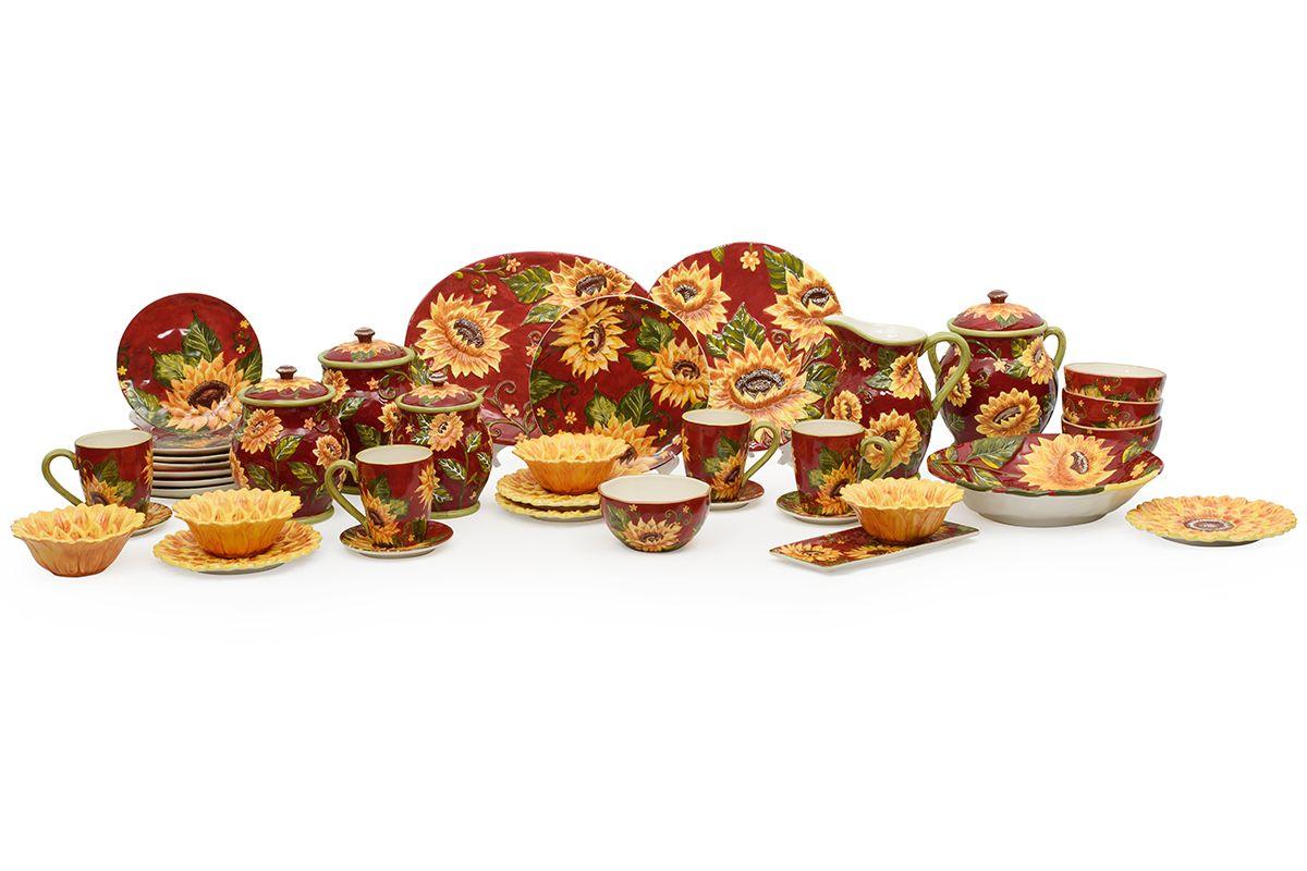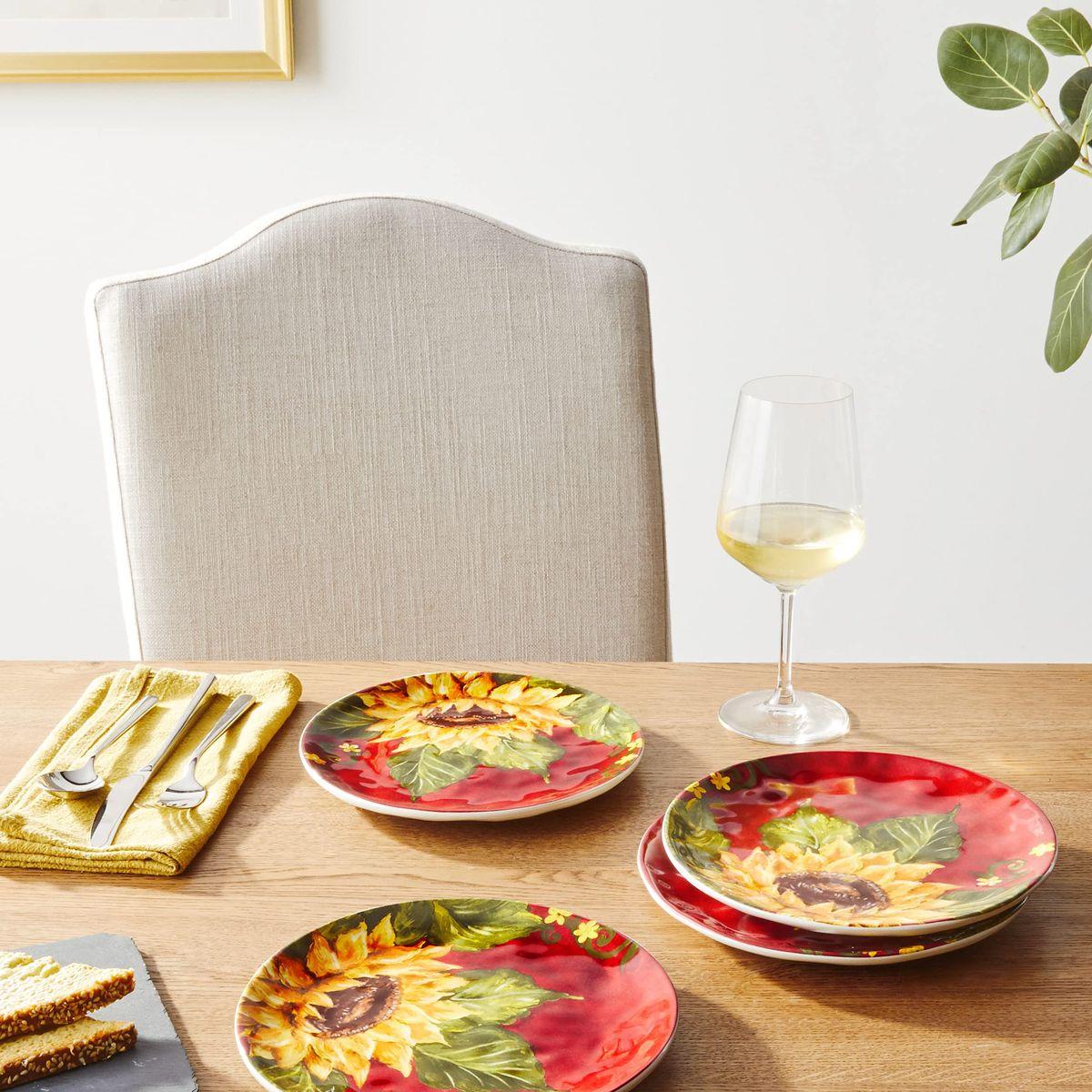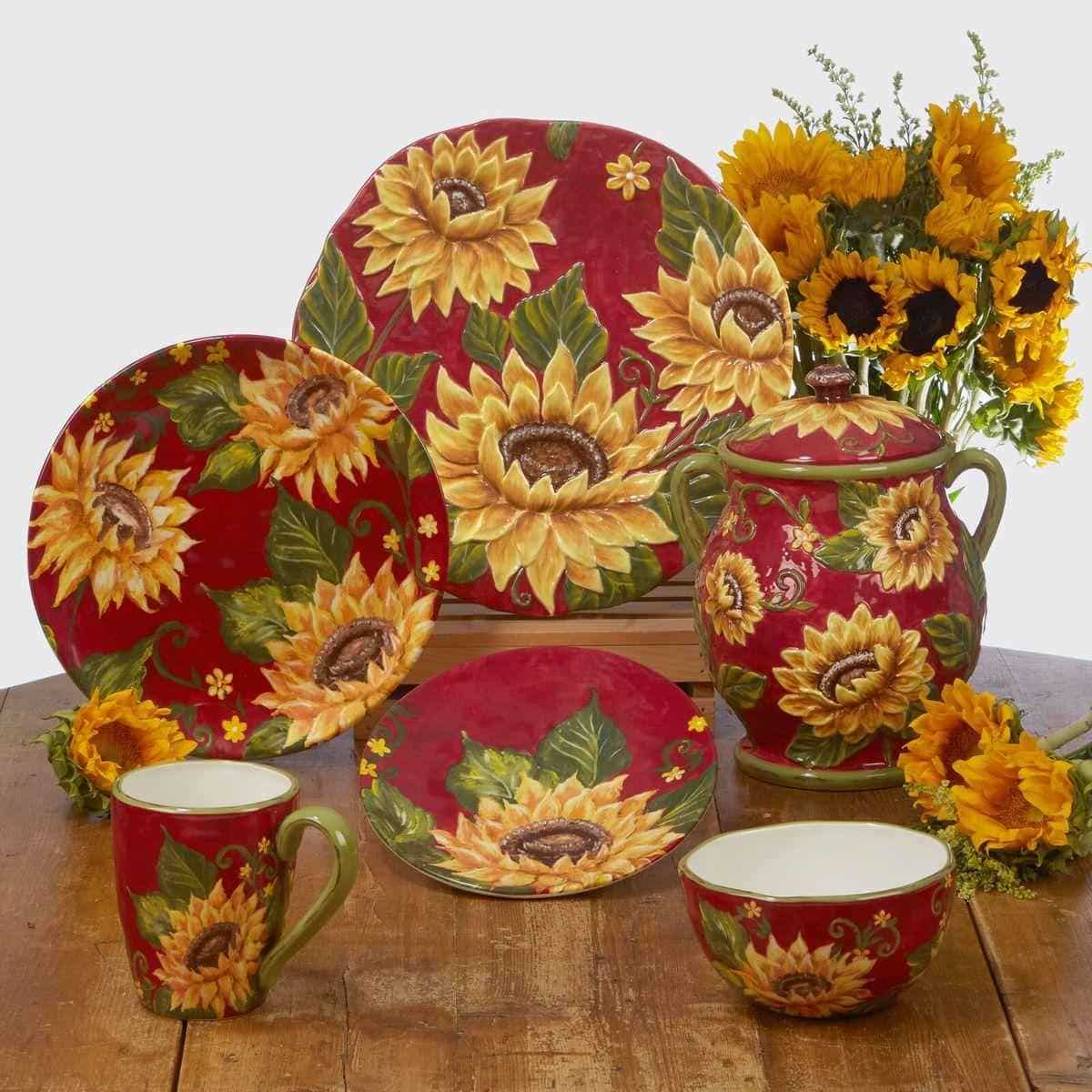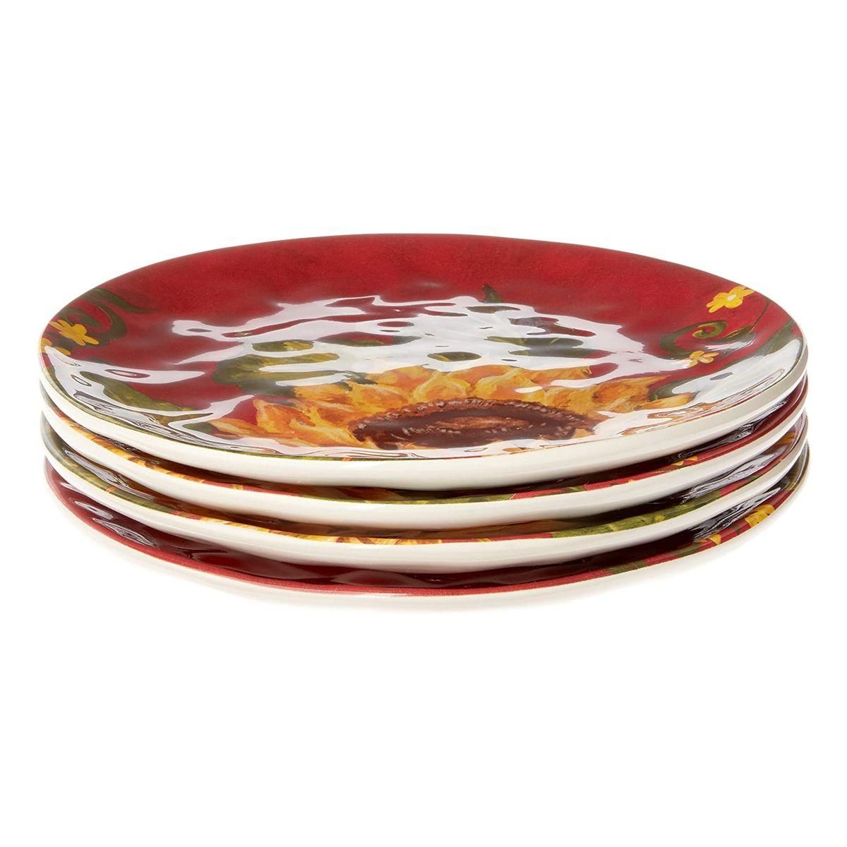 Оригінальний дизайн у вигляді соковитих жовтих соняшників на тлі яскраво-червоного західного неба, що прикрасив салатні тарілки, розроблений та втілений у життя студією художнього декору Tre Sorelle Studios. Принт зроблений у високій роздільній здатності, тому розглянути кожну деталь олійного живопису можна неозброєним оком.