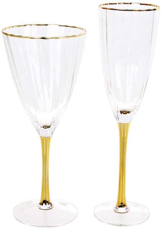 Выполнены из идеально прозрачного стекла. Дизайнеры со вкусом подошли к оформлению фужеров - ненавязчивые золотые элементы будут уместны при любом стиле сервировки. Утонченная форма с золотистой ножкой и каймой создает праздничную атмосферу за столом.