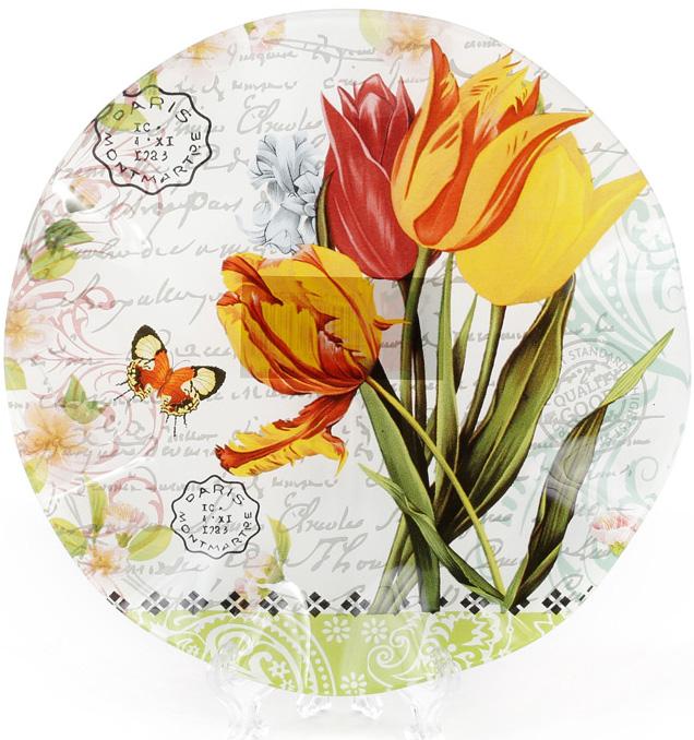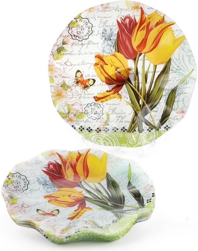 Изготовлены из качественного стекла с ярким цветочным декором - красные и желтые тюльпаны, Классическая круглая форма с волнистым краем