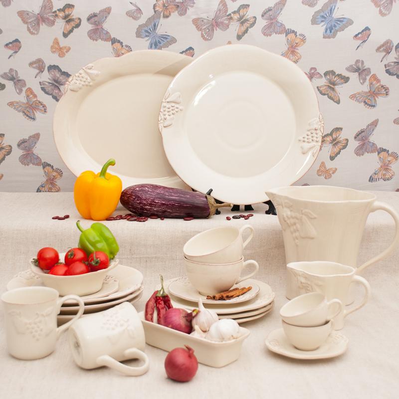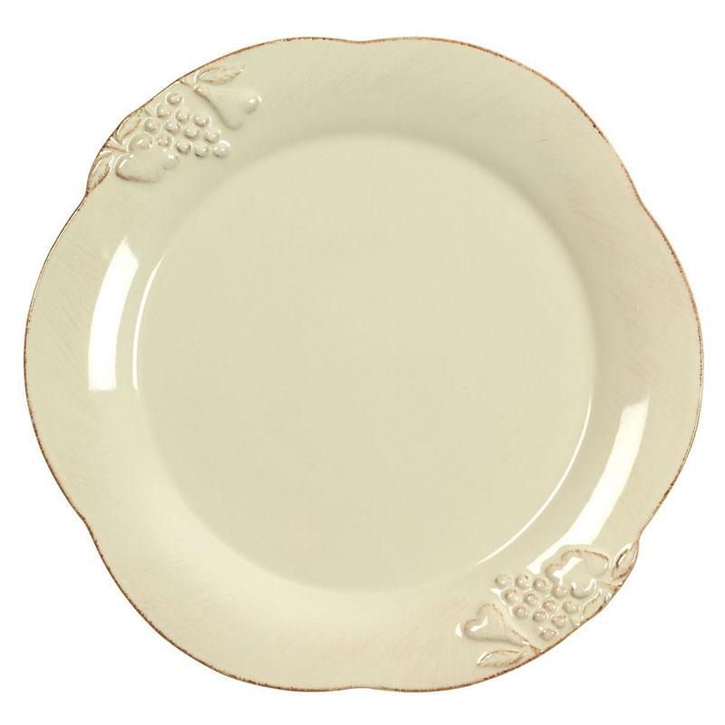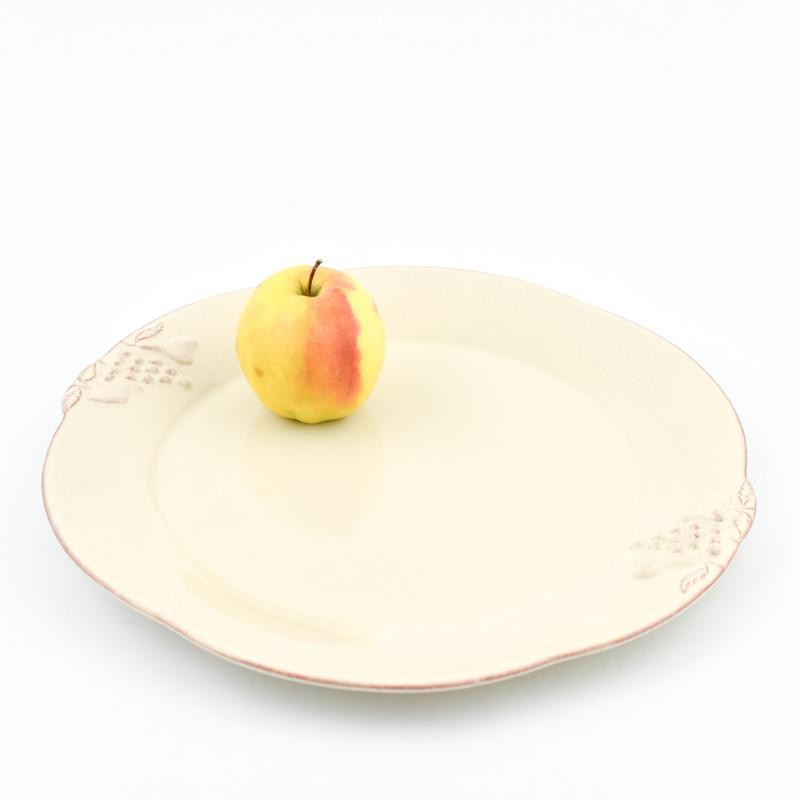 Большое блюдо молочного оттенка слоновой кости напоминает форму цветка. Выпуклый декор – натюрморт из винограда, груши и яблока – симметрично расположен с двух сторон. Легкая «потертость» символизирует стиль кантри прошлых веков. Размер позволяет организовать эффектную подачу торта, фруктов или канапе на шпажках.