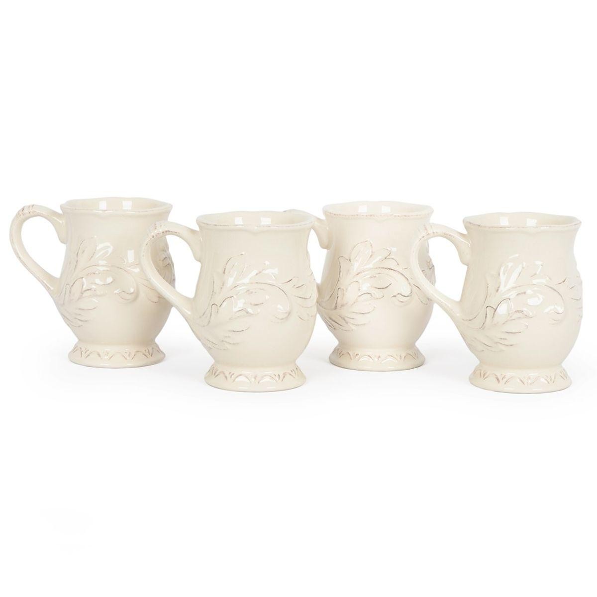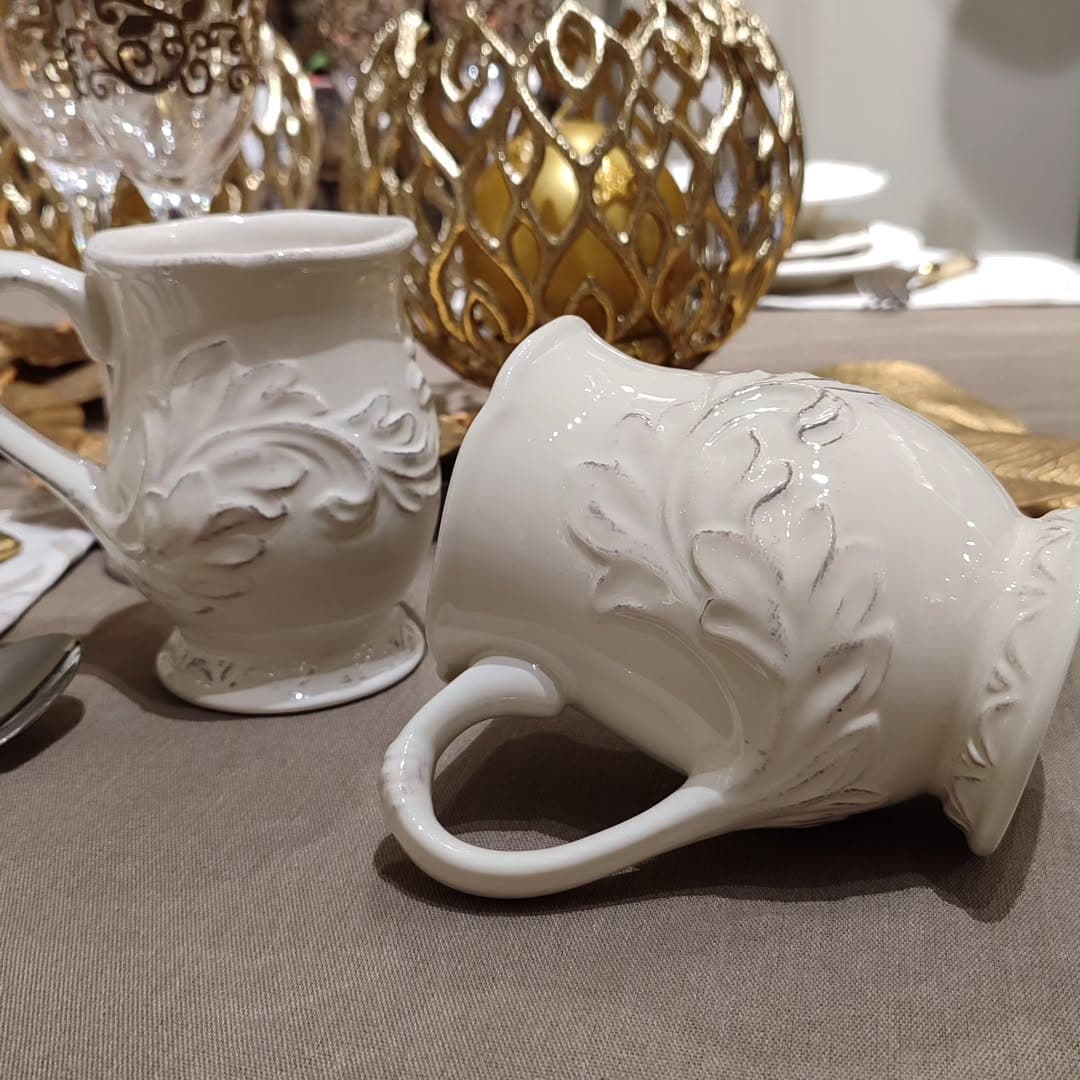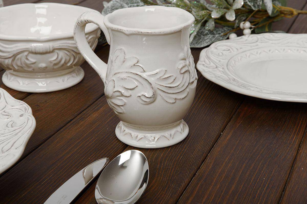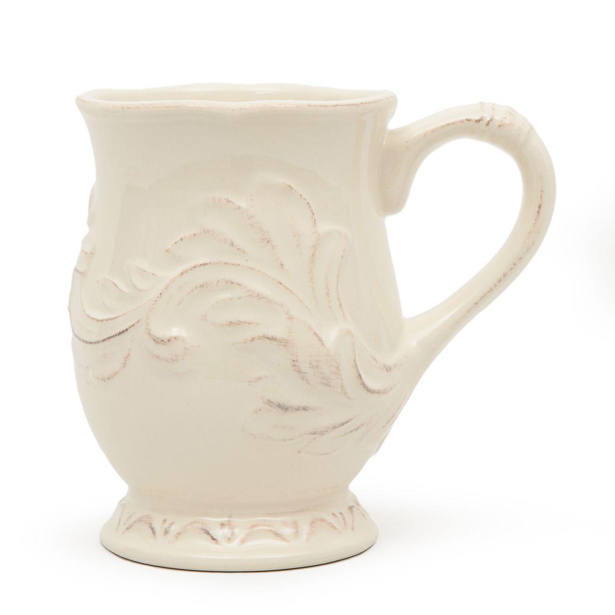 Кружки элегантного оттенка айвори украшают тисненые зубчатые листья аканта – величественного символа триумфа. Эффект патины, едва коснувшийся рельефных узоров, придает изделиям винтажный вид.