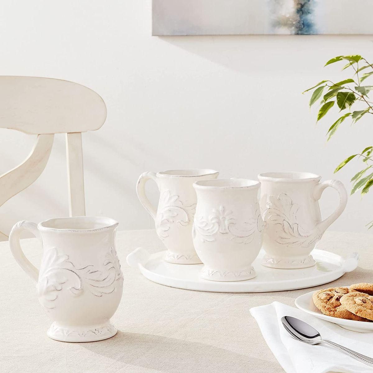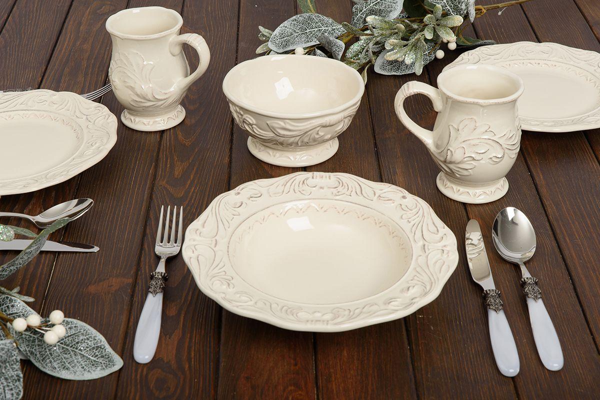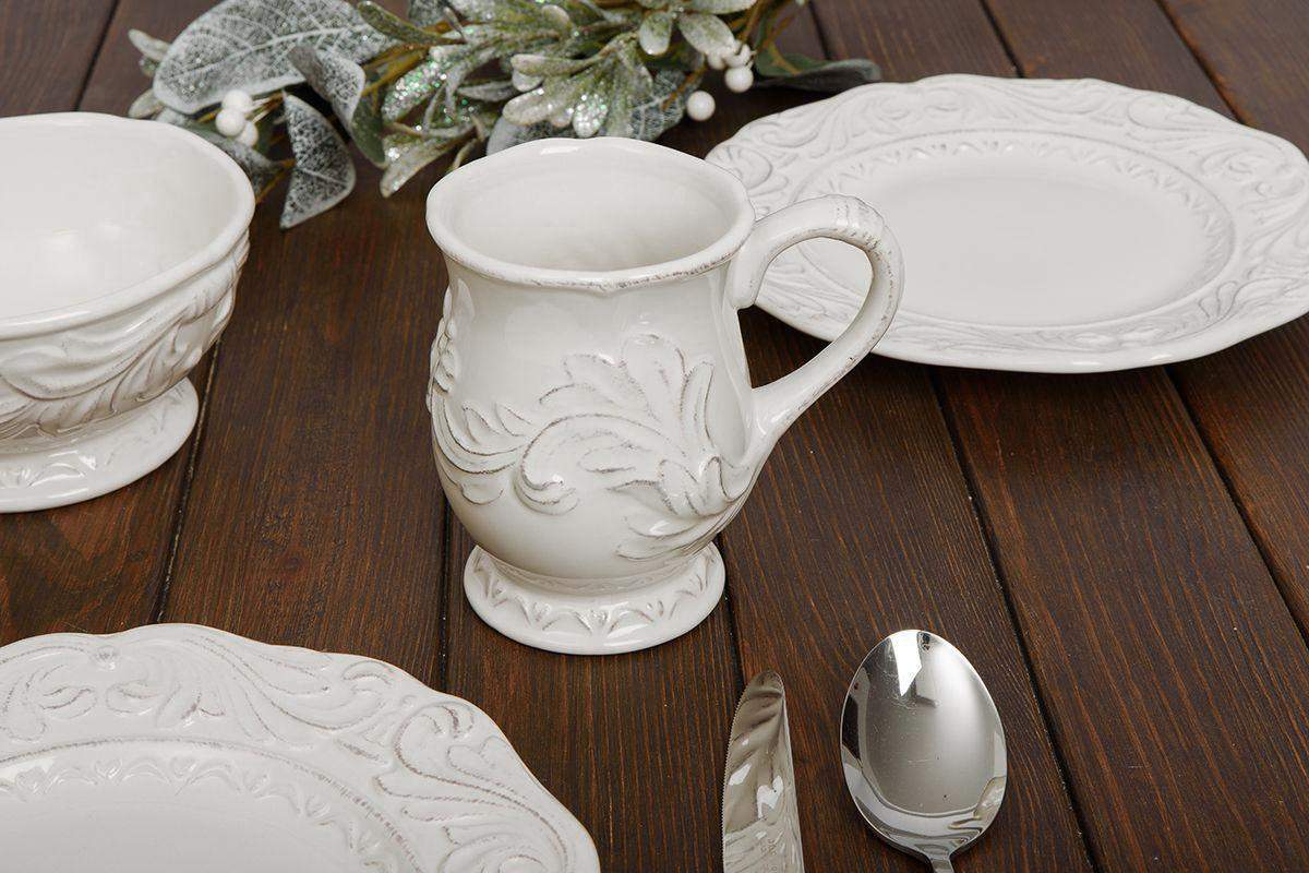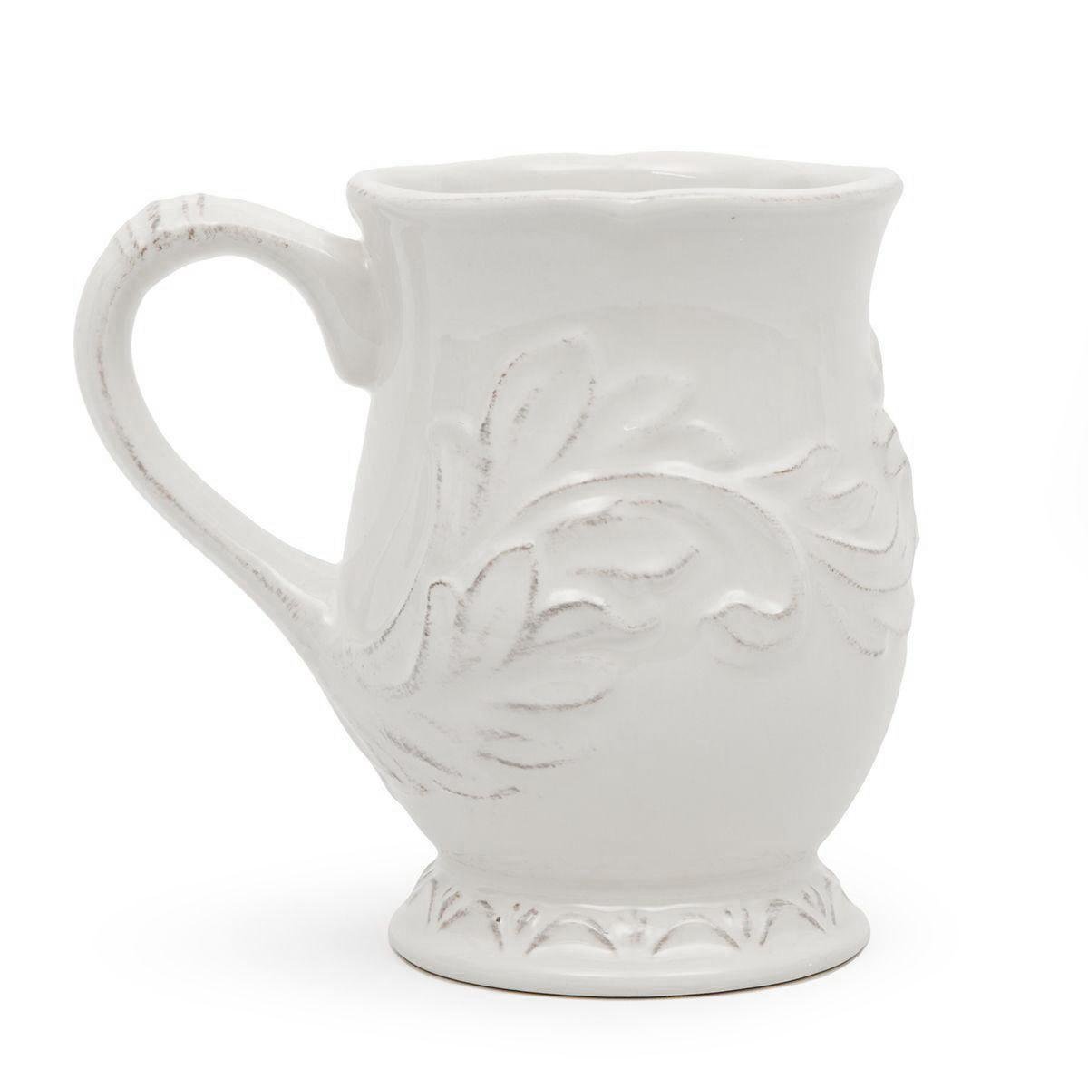 Кружки элегантного оттенка айвори украшают тисненые зубчатые листья аканта – величественного символа триумфа. Эффект патины, едва коснувшийся рельефных узоров, придает изделиям винтажный вид.