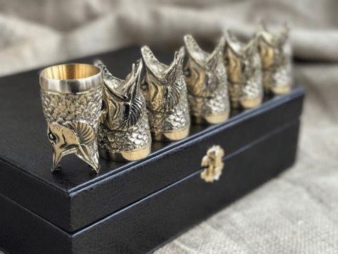 Комплект из 6-и рюмок в форме Щуки , выполненных методом художественного литья из бронзы. Стаканчик из нержавеющей стали емкостью 30 мл. Все рюмки ставятся на голову. Общая высота чарки 75мм, ширина 45мм