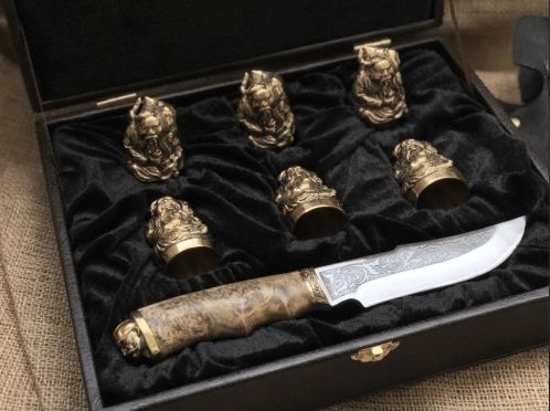 Подарункові чарки оригінальний подарунок на будь-яке свято! Ручна робота! Зроблено в Україні! Характеристики: Матеріал – латунь, нержавіюча сталь покрита харчовим булатуванням Висота – 75 мм Об'єм стопки – 45 млФутляр-шкірзам