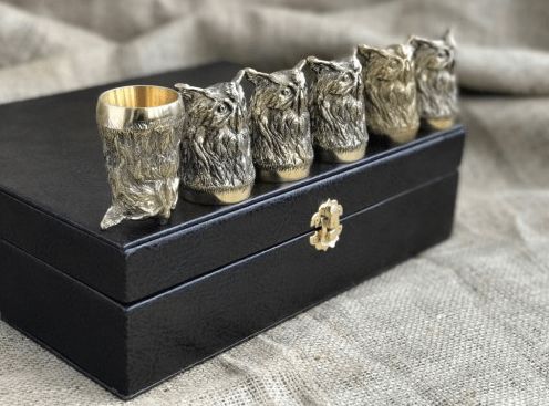 Характеристики: Матеріал – латунь, нержавіюча сталь покрита харчовим булатуванням Висота – 60 мм Об'єм стопки – 30 мл