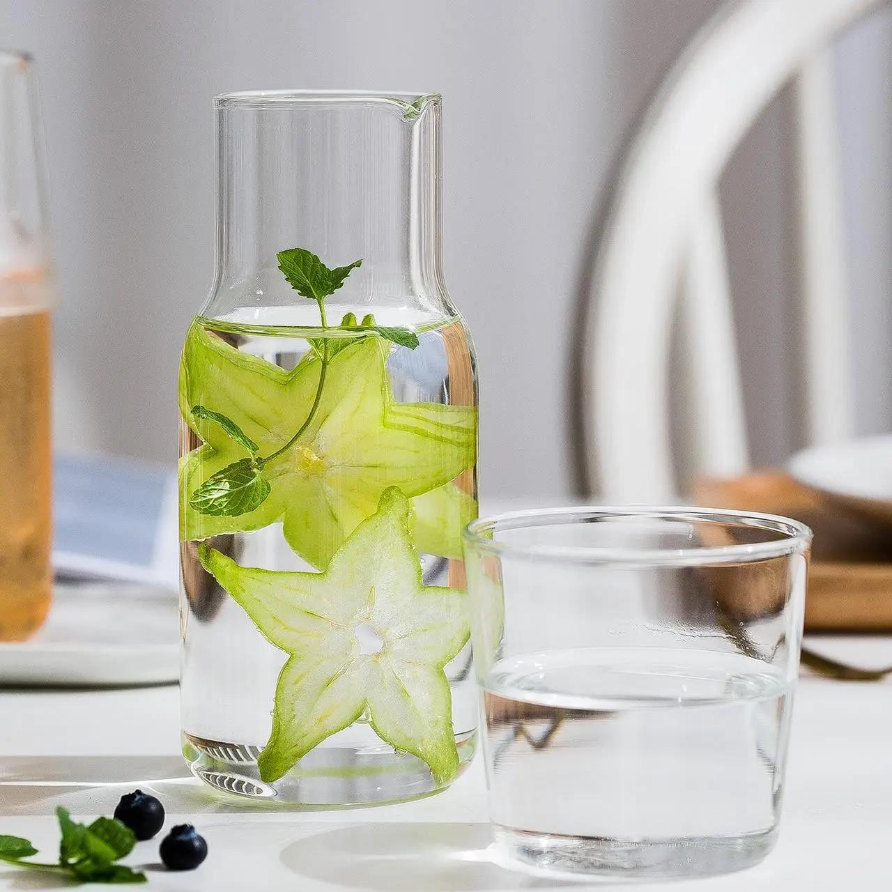 Кожна деталь набору "Вода/молоко" продумана до дрібниць: широке горло зручно наповнювати, склянка щільно сідає зверху, економлячи місце, а прозоре боросилікатне скло виглядає лаконічно та гармонійно в будь-якому інтер'єрі. Він не привертає увагу — але саме цим і приваблює.