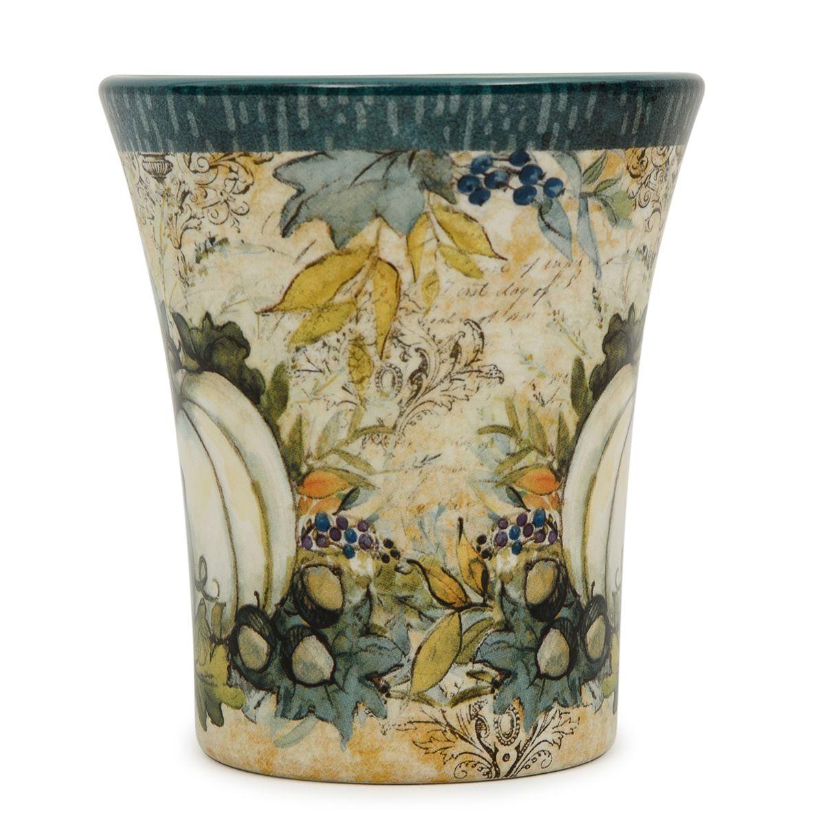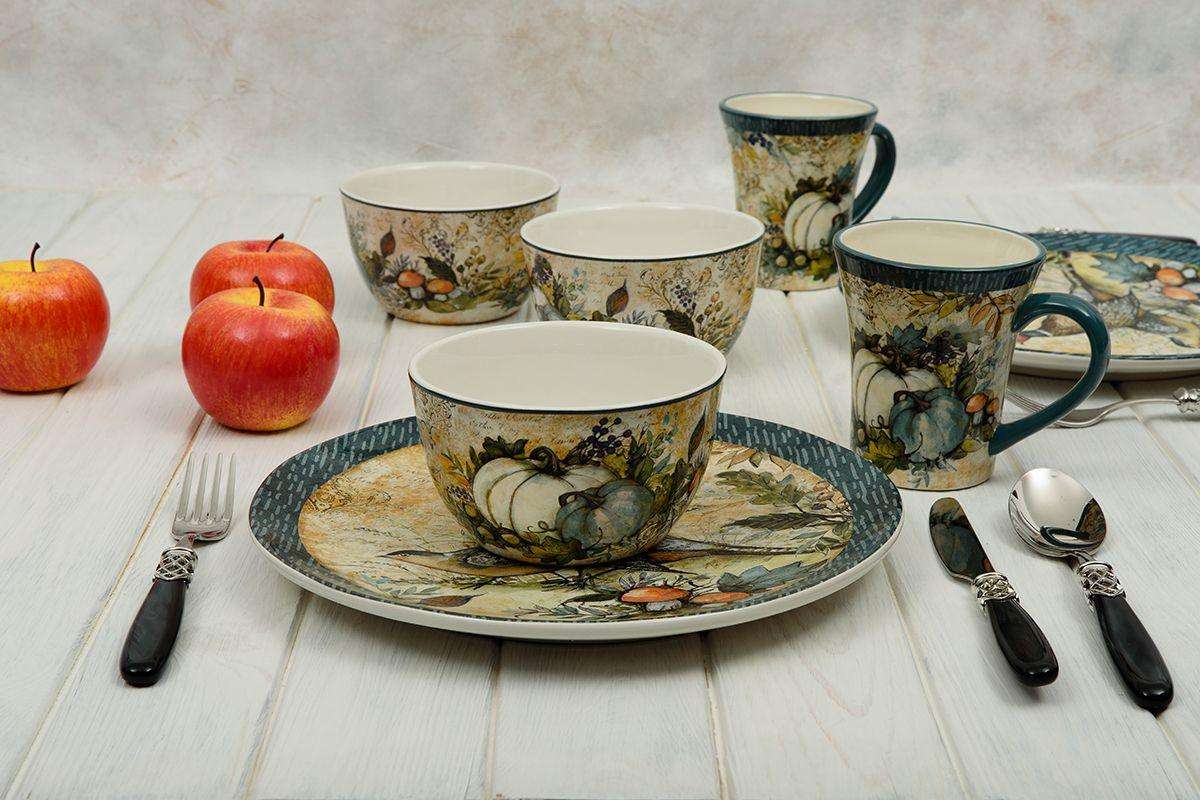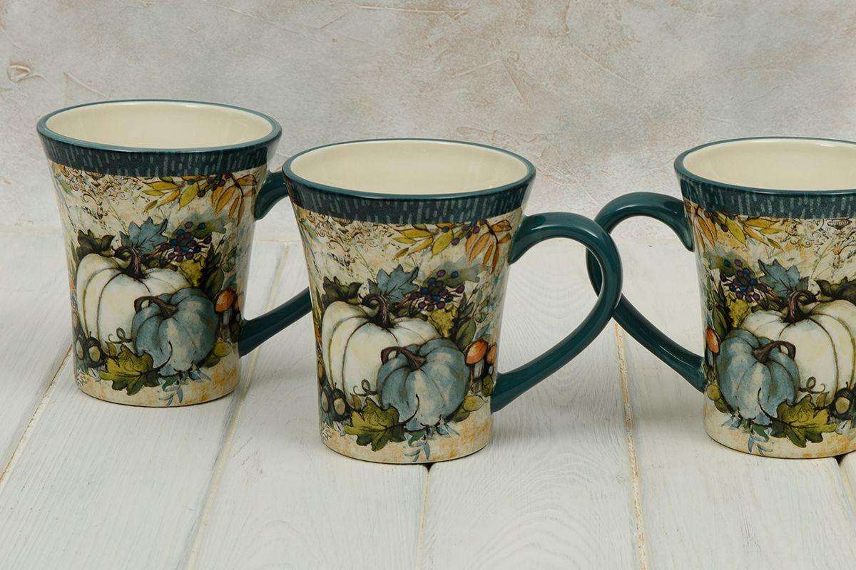 Изысканные чашки из коллекции «Щедрый урожай» отлично оттенят интерьер помещения и станут любимчиками во время чаепития. Кружки большого объема, удобной формы, с оригинальным изображением пары тыкв и других растений в акварельной технике, синие ручки и ободок красиво контрастируют с основным рисунком. Выполнены чашки из прочной керамики и покрыты слоем стойкой глазури, которая защищает покрытие от потертостей и сколов, а также придает изделиям красивый блеск.