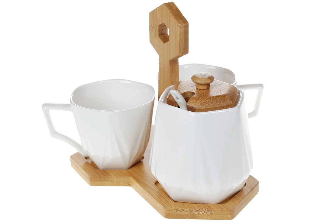 Набор кружек Натурель с бамбуковыми блюдцами (костерами). Классический белый цвет для любого стиля сервировки. Бамбуковая стойка для сушки и хранения чашек. Натуральный бамбук выгодно сочетается с белым фарфором и классической формой кружек.