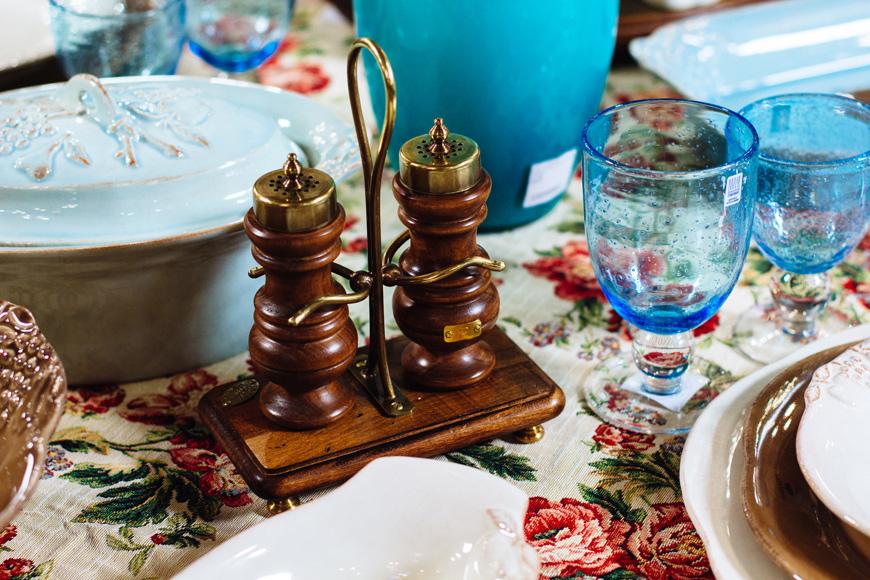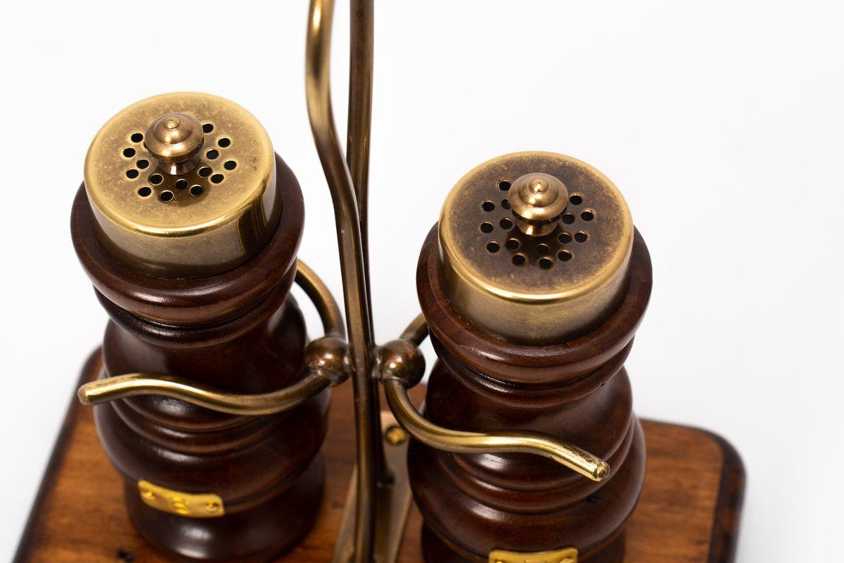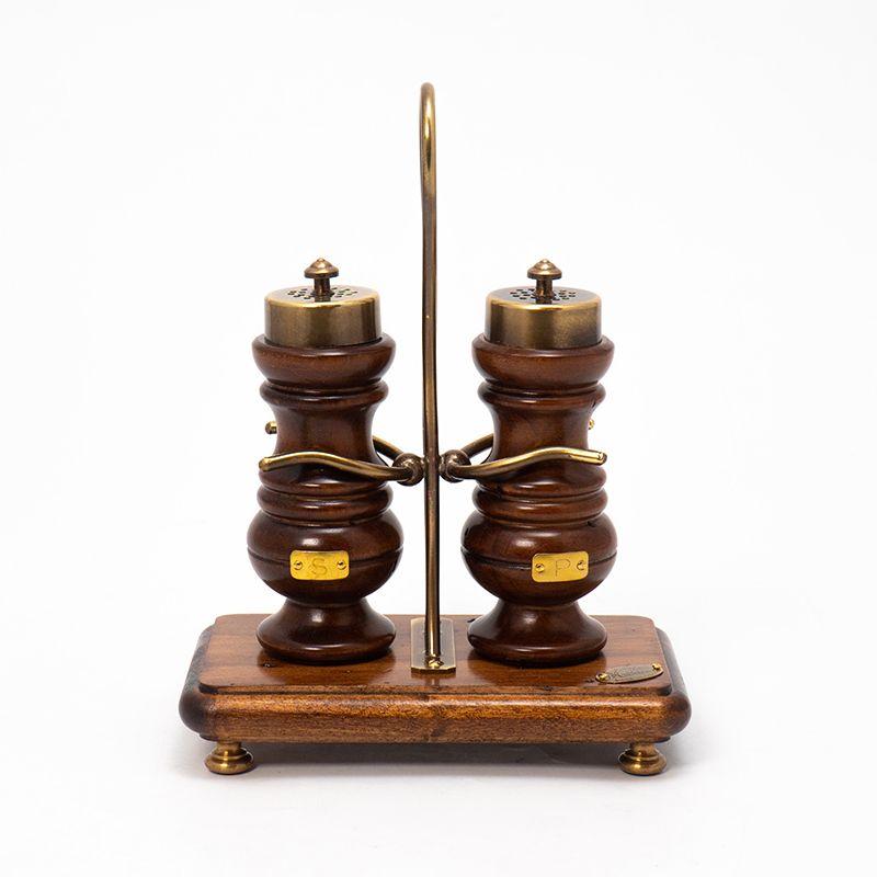 Ємності для солі та перцю на підставці виконані з антикварного дерева та декоровані зістареною латунню. Сільничка відзначена буквою "S" - sale/сіль, а перечниця буквою "P" - pepe/перець. Резервуари для спецій виготовлені із харчового пластику. Для того щоб наповнити їх сіллю або перцем, потрібно зняти латунний розсіювач у його верхній частині.
