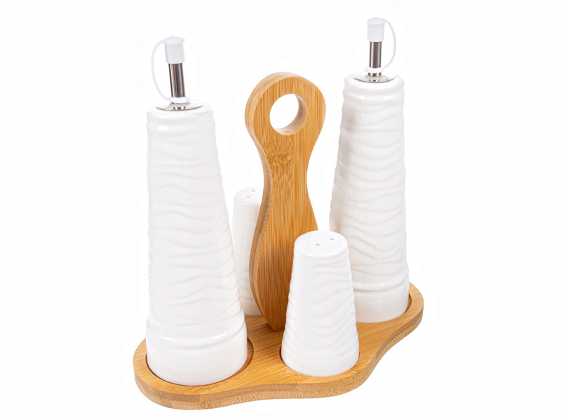 Стильный набор для специй создан для аккуратной и красивой сервировки. Белый фарфор с фактурным рельефом смотрится свежо и современно, а тёплая бамбуковая подставка добавляет натуральный акцент и устойчивость. Компактные размеры 22,3х14,5х23,5 см позволяют легко разместить набор на кухонной столешнице или прямо на столе во время обеда.