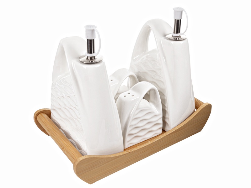 В комплект входят две бутылочки с дозаторами для масла и уксуса, солонка и перечница, а также бамбуковый лоток-основание. Продуманные формы удобны в ежедневном использовании: дозаторы обеспечивают тонкую подачу без лишних капель, а шейкеры равномерно распределяют соль и перец.