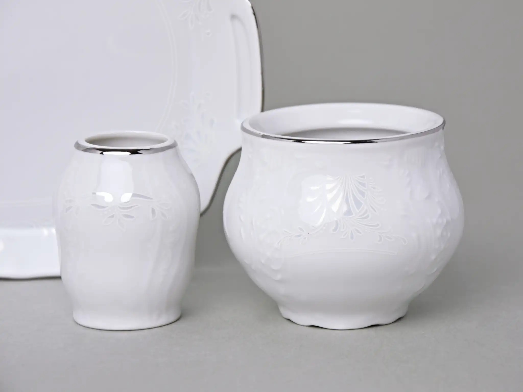 Особое внимание заслуживает платиновое обрамление — тонкая, изысканная линия, подчеркивающая форму каждого изделия. Такое оформление придаёт набору нотку благородства, не перегружая его внешне. Этот акцент делает фарфор по-настоящему праздничным и подчёркивает его принадлежность к коллекционным сервизам высокого класса.