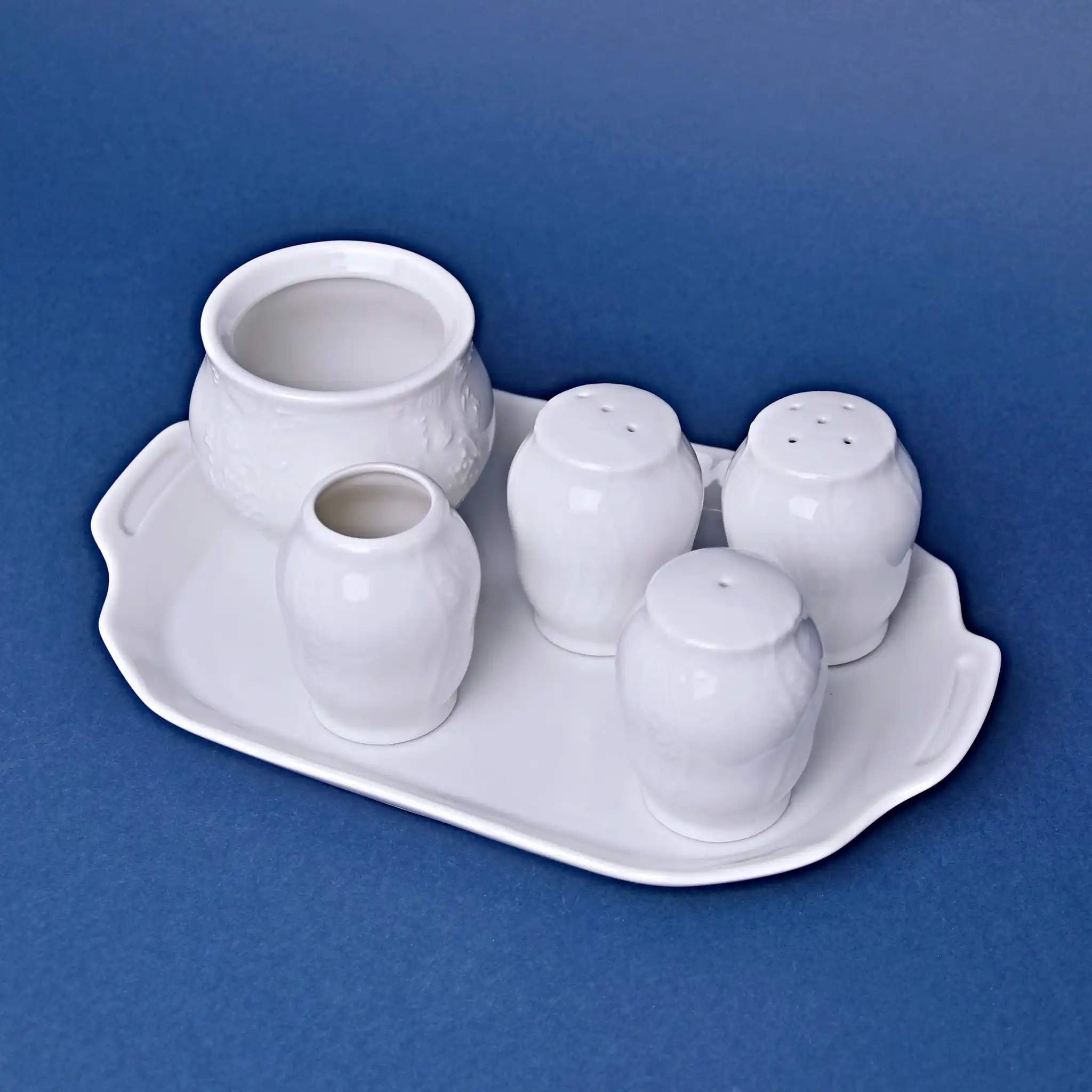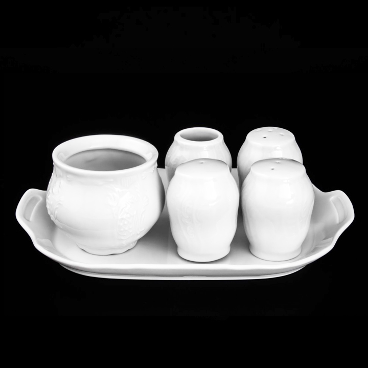 Каждый элемент набора выполнен с исключительной точностью. Перечницы и солонка удобно лежат в руке, горчичница закрывается плотной крышкой, а подставка для зубочисток добавляет завершенности. Все предметы собраны на аккуратном фарфоровом подносе — благодаря чему всё нужное всегда под рукой и красиво организовано. Этот набор — пример того, как простота и роскошь могут гармонично сосуществовать.