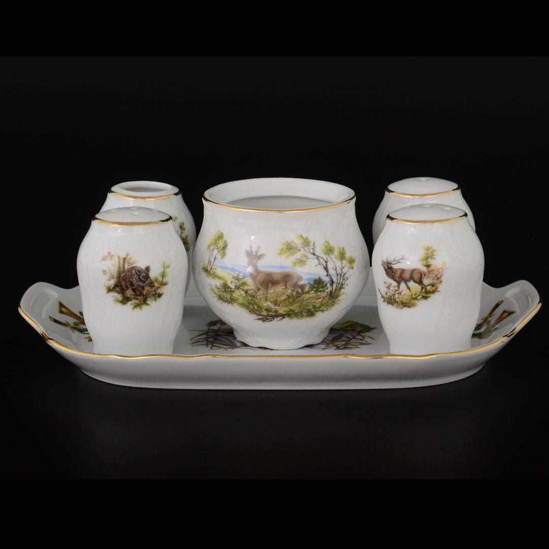Набор для специй фарфоровый цветной с рисунком Bernadotte Охота 7 пр с золотым кантом