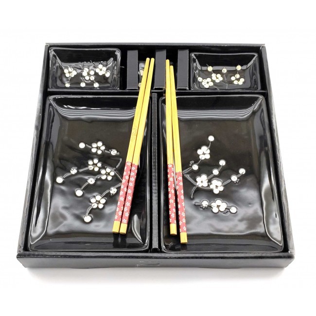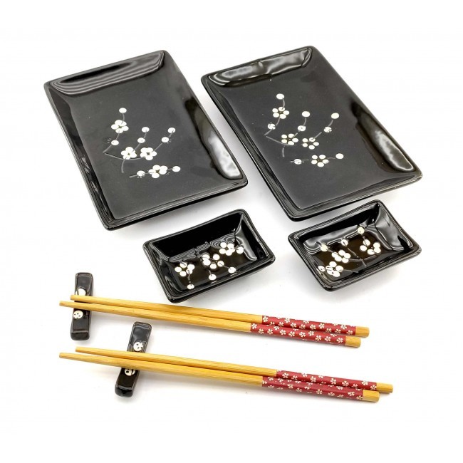 Прекрасний набір для поціновувачів східної кухні. Набір розрахований на дві особи, в наборі дві керамічні тарілки прямокутної форми. Легкі та гладкі бамбукові палички, два комплекти, які не розмокають та не деформуються при правильному зберіганні. Дві керамічні підставки для паличок. Дві керамічні соусниці. Набір упакований у картонну коробку з пластиковою кришкою. Кожен предмет набору має свій окремий осередок для зручного зберігання.