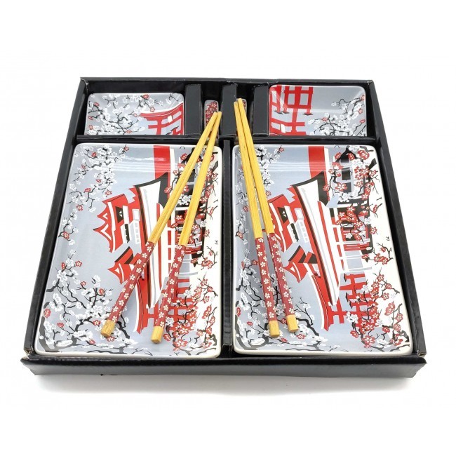 Набір розрахований на дві особи, в наборі дві керамічні тарілки прямокутної форми. Легкі та гладкі бамбукові палички, два комплекти, які не розмокають та не деформуються при правильному зберіганні. Дві керамічні підставки для паличок. Дві керамічні соусниці. Набір упакований у картонну коробку з пластиковою кришкою. Кожен предмет набору має свій окремий осередок для зручного зберігання.