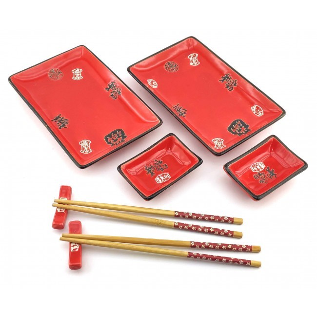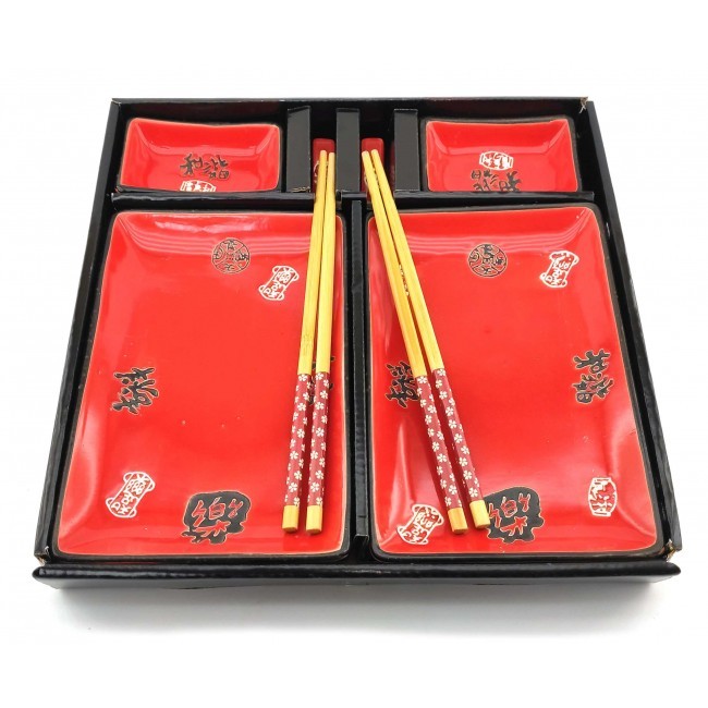 Набір розрахований на дві особи, в наборі дві керамічні тарілки прямокутної форми. Легкі та гладкі бамбукові палички, два комплекти, які не розмокають та не деформуються при правильному зберіганні. Дві керамічні підставки для паличок. Дві керамічні соусниці. Набір упакований у картонну коробку з пластиковою кришкою. Кожен предмет набору має свій окремий осередок для зручного зберігання.