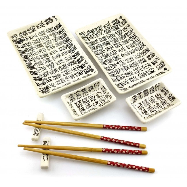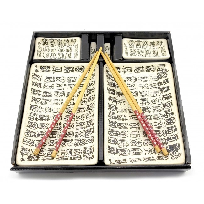 Прекрасний набір для поціновувачів східної кухні. Набір розрахований на дві особи, в наборі дві керамічні тарілки прямокутної форми. Легкі та гладкі бамбукові палички, два комплекти, які не розмокають та не деформуються при правильному зберіганні. Дві керамічні підставки для паличок. Дві керамічні соусниці. Набір упакований у картонну коробку з пластиковою кришкою. Кожен предмет набору має свій окремий осередок для зручного зберігання.