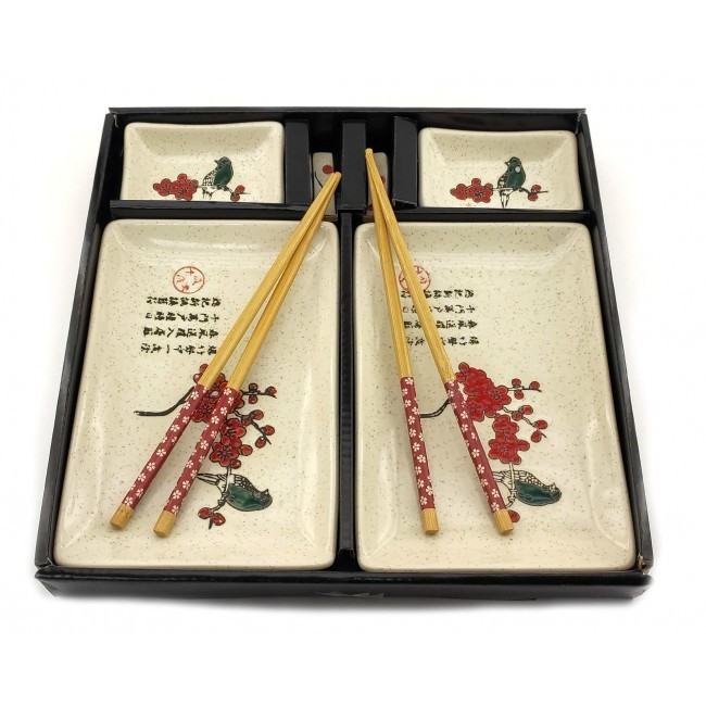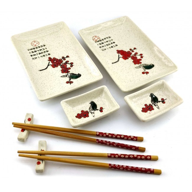Набір розрахований на дві особи, в наборі дві керамічні тарілки прямокутної форми. Легкі та гладкі бамбукові палички, два комплекти, які не розмокають та не деформуються при правильному зберіганні. Дві керамічні підставки для паличок. Дві керамічні соусниці. Набір упакований у картонну коробку з пластиковою кришкою. Кожен предмет набору має свій окремий осередок для зручного зберігання.