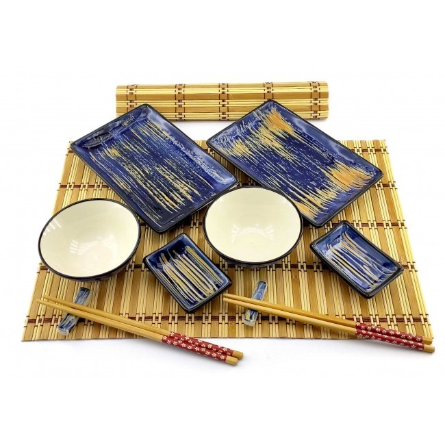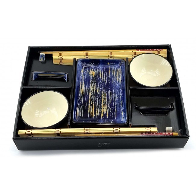 Прекрасный набор для ценителей восточной кухни. Набор рассчитан на две персоны, в наборе две керамические тарелки прямоугольной формы. Легкие и гладкие бамбуковые палочки, два комплекта, которые не размокают и не деформируются при правильном хранении. Две керамические подставки для палочек. Две керамические соусницы. Две керамические пиалы. Два бамбуковых коврика. Набор упакован в картонную коробку с пластиковой крышкой. Каждый предмет набора имеет свою отдельную ячейку для удобного хранения.