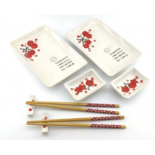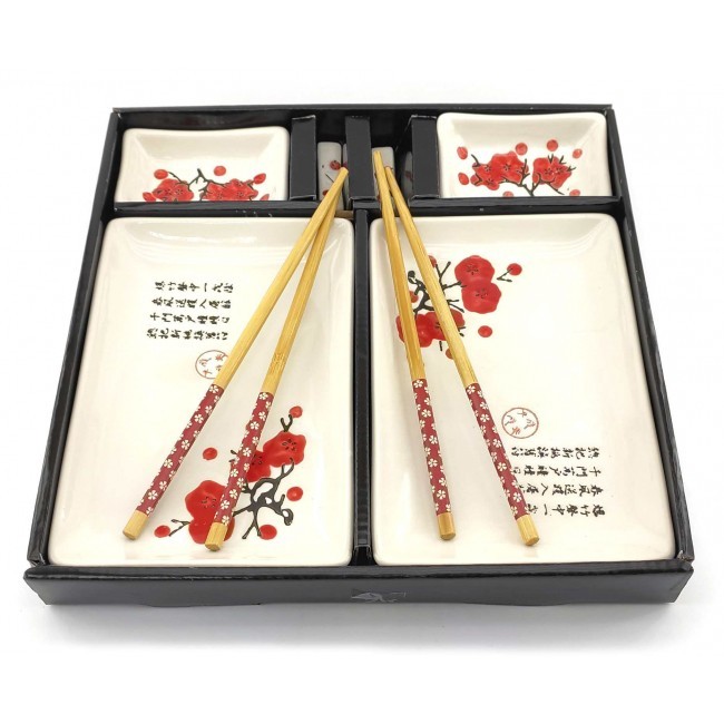 Набір розрахований на дві особи, в наборі дві керамічні тарілки прямокутної форми. Легкі та гладкі бамбукові палички, два комплекти, які не розмокають та не деформуються при правильному зберіганні. Дві керамічні підставки для паличок. Дві керамічні соусниці. Набір упакований у картонну коробку з пластиковою кришкою. Кожен предмет набору має свій окремий осередок для зручного зберігання.