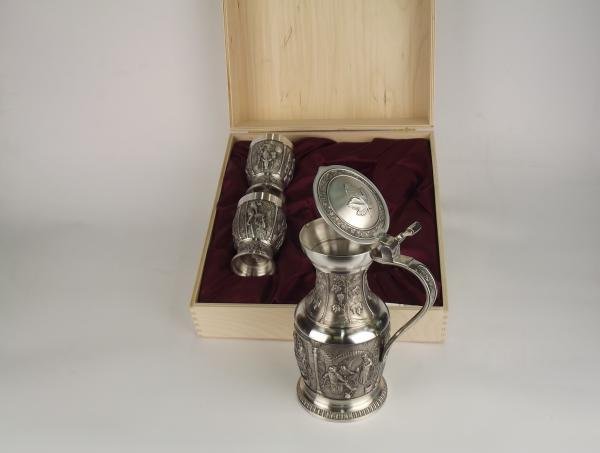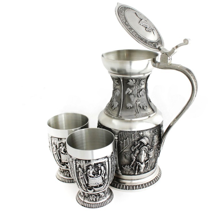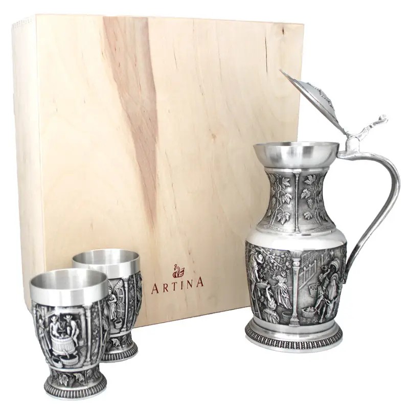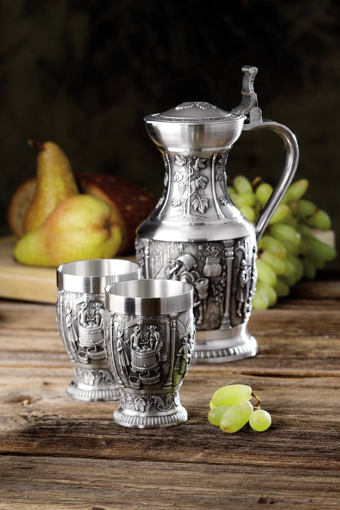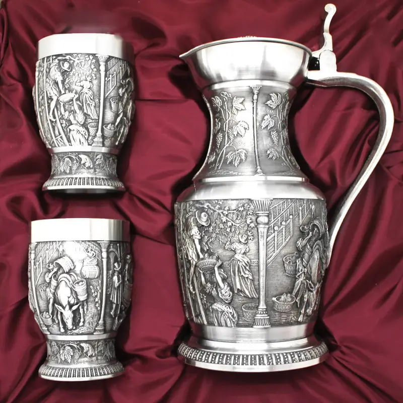 Цей вишуканий набір ніби зійшов зі сторінок старовинних європейських легенд. Тонка робота майстрів, витончене карбування та матовий блиск олова надають кожному елементу колекції особливої величності. "Урожай" — це не просто набір для вина, це втілення традицій, стилю та поваги до напою богів.