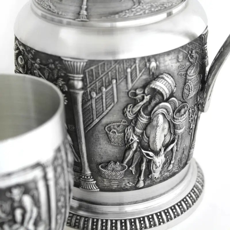 Кожна деталь створена з любов’ю до мистецтва: на глечику та келихах зображені сцени збору винограду, які нагадують про вічні цінності — працю, гостинність та радість життя. Тримаючи в руці такий келих, ви немов переноситеся у стару виноробню посеред сонячної долини.
