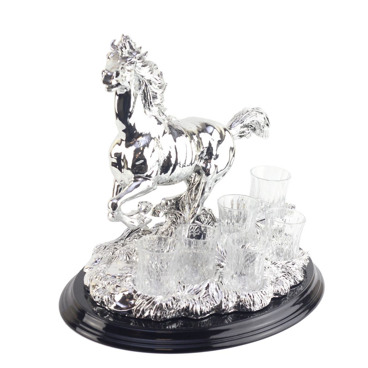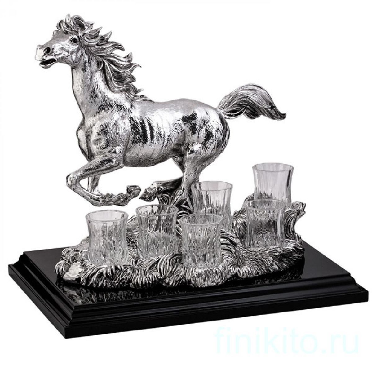 Набор для водки "Бегущая лошадь", на деревянной подставке, 6 стопок, цвет: серебряный. Италия