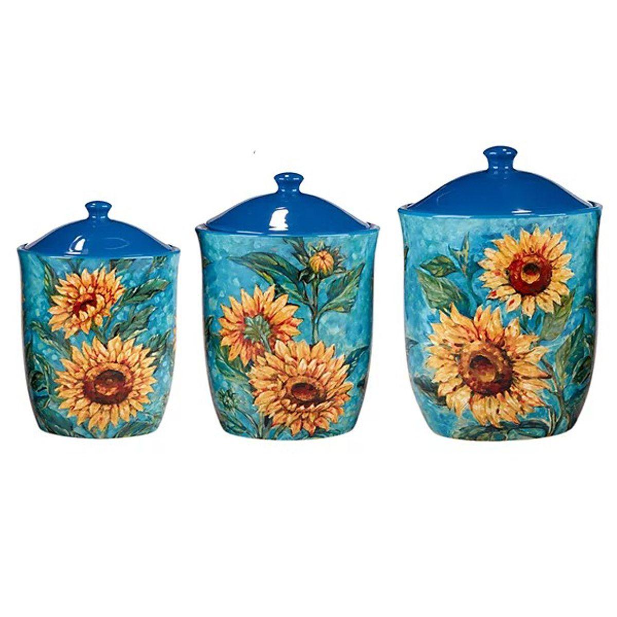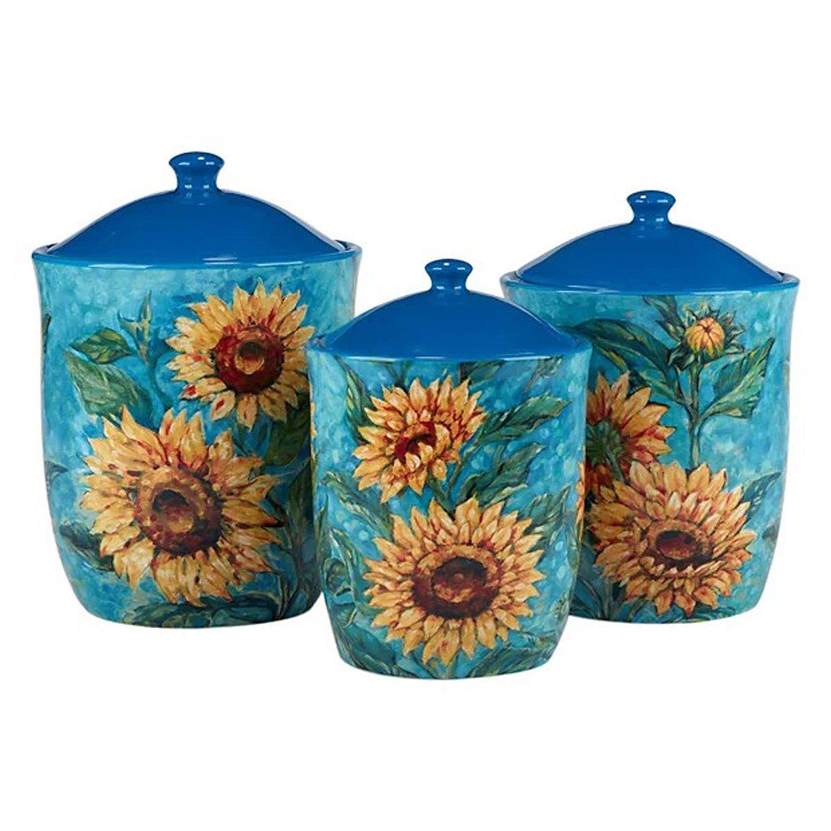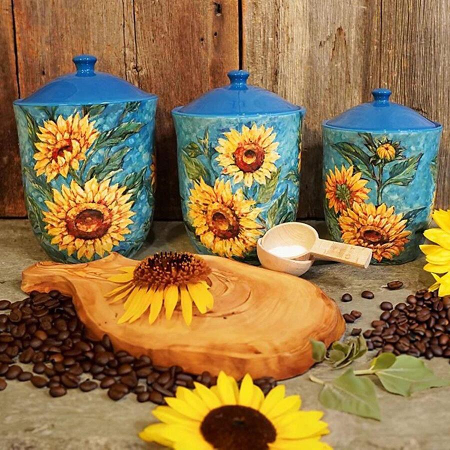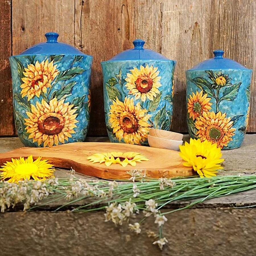 Набор из 3-х емкостей для хранения в голубом цвете "Золотистые Подсолнухи" от Certified International – это стильное и практичное решение для кухни. Яркий дизайн с подсолнухами на голубом фоне добавит вашему пространству тепла и уюта. Емкости разного размера позволяют удобно хранить сыпучие продукты, такие как сахар, мука, крупы или чай.