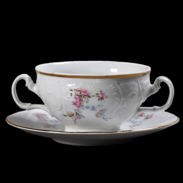Набор фарфоровых бульонниц с блюдцами белого цвета с золотой каёмочкой Thun Bernadotte Дикая Роза 12 пр/6 п (360 мл)