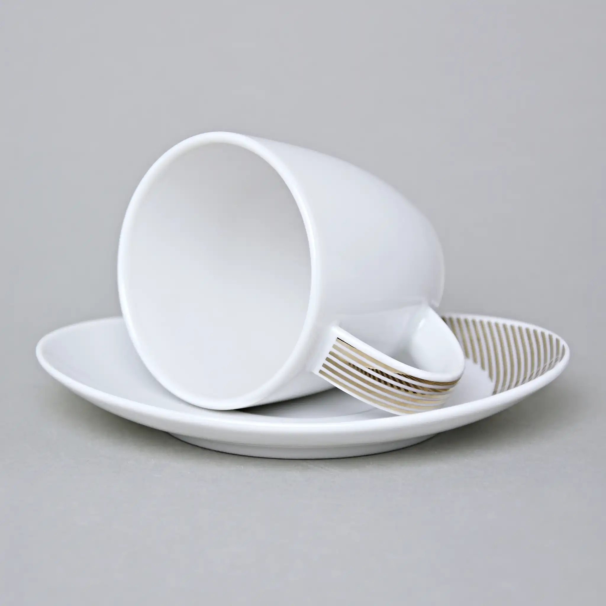Эти чашки с блюдцами — словно белоснежные мини-скульптуры, созданные для утреннего вдохновения. Коллекция Loos объединяет чистоту формы, графическую точность и фарфоровую лёгкость. На фоне белоснежной поверхности изысканно играет тонкий линейный декор — будто золотистое эхо движения, лёгкое касание стиля.