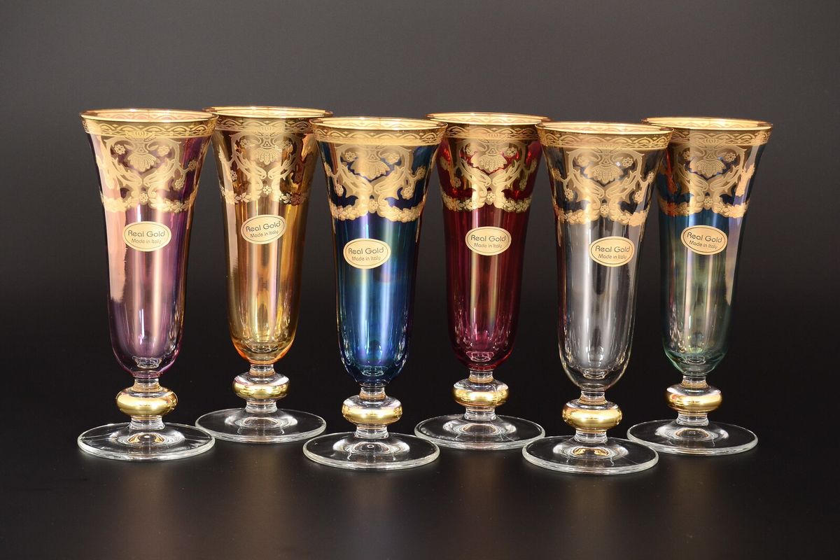 Набор хрустальных цветных фужеров для шампанского Меандр Голд, 150 мл, 6 шт
