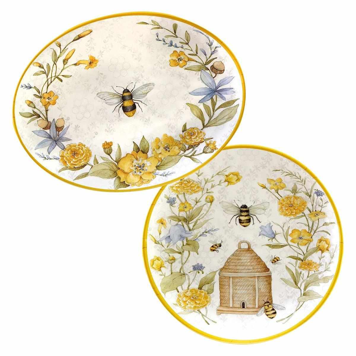 Набор из 2-х блюд «Сладкий мёд» от Certified International изготовлен из прочного меламина и украшен солнечными рисунками пчёл, ульев и жёлтых цветов. В комплект входят круглое блюдо диаметром 36 см и овальное размером 46×34 см, что делает набор удобным для подачи десертов, фруктов и закусок. Меламин устойчив к ударам и лёгкий, а блюда можно мыть в посудомоечной машине при температуре до 70 °C. Не рекомендуется использовать абразивные средства и помещать изделия в микроволновку или духовку. Посуда создана в США и производится на заводах Certified International в Китае. Это практичный и яркий акцент, который наполняет сервировку теплом и летним настроением.