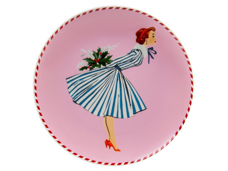 Набор из двух фарфоровых тарелок диаметром 20,5 см создан, чтобы добавить изысканности и праздничного настроения на ваш стол. Их украшает ретро-дизайн с изображением элегантной девушки в полосатом платье и ярких туфлях. Лёгкий розовый фон и аккуратная окантовка в виде красно-белых полос создают ощущение тепла, уюта и праздничного стиля.